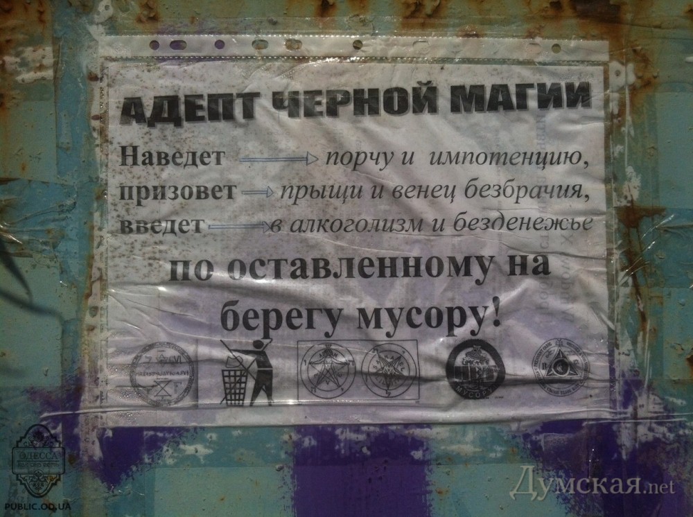 В пригороде Одессы черный маг грозит импотенцией неряшливым пляжникам (фотофакт)Необычные объявления расклеены в прибрежной зоне одесского пригорода Фонтанка. На жителей и гостей села обещают наслать различные беды за загрязнение пляжей. СМЕРТЬ РОСІЙСЬКИМ ОКУПАНТАМ! Помітили помилку? Виділяйте слова з помилкою та натискайте control-enter |