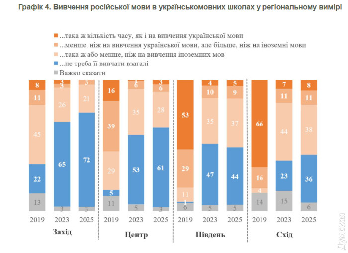 Опрос показал, что меняется и отношение к изучению русского языка в школах. Если еще в 2019 году 81% украинцев поддерживали его изучение, то в 2025-м таких осталось 38%, и только 9% выступают за его преподавание на уровне или выше других иностранных языков. На юге мнения в этом вопросе раздедились почти поровну: 51% все еще поддерживают изучение русского, а 44% - выступают против. Для сравнения: еще в 2019 году таких в регионе было всего 1%.