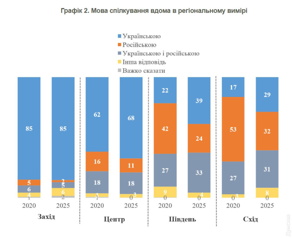 Согласно опросу, 63% утверждает, что дома говорят на украинском языке. На русском общаются 13%, еще 19% используют оба языка. Процент жителей южных регионов, которые перешли на государственный язык в быту, вырос с 22% до 39%. В то же время часть русскоязычных уменьшилась с 42% до 24%. Еще примерно треть жителей используют при общении оба языка — это больше, чем в 2020.