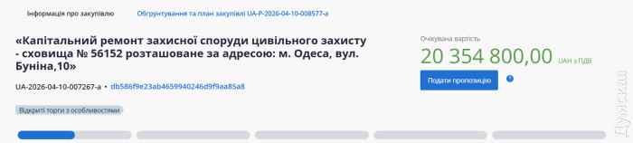 Капремонт із дизель-генератором та телефонами: на укриття в центрі Одеси витратять понад 20 млн гривень (фото, відео)Понад 20,3 млн гривень планує виділити на ремонт укриття, розташованого на вулиці Ніни Строкатої (раніше Буніна), 10, одеська мерія. Підрядника на платформі Prozorro шукає управління капітального будівництва міської ради. Згідно з тендерною документацією, на об'єкті виконають повний цикл демонтажних робіт, включаючи розбирання старих покриттів, перегородок і систем комунікацій. Надалі в укритті облаштують сучасні інженерні мережі: системи опалення з використанням конвекторів, вентиляцію, каналізацію, водо- та електропостачання. Сховище обладнають дизель-генератором для автономної роботи, а також встановлять системи протипожежного захисту: сигналізацію, оповіщення та автоматичне порошкове гасіння. В укритті будуть столи, 440 місць для сидіння, шафи, а також медичний куточок і техніка для міні-кухні: холодильники, мікрохвильову піч та електрочайник. Крім того, у приміщенні розмістять комп'ютер і 5 телефонів. Підлоги оброблять спеціальним протигрибковим засобом. Для маломобільних груп населення буде встановлено електромеханічний платформний підйомник. Важлива вимога до підрядника — дотримання правил міського благоустрою. У разі необхідності проведення робіт, що зачіпають територію навколо будівлі, виконавець зобов'язаний отримати відповідний дозвіл і після завершення ремонту повністю відновити благоустрій відповідно до вимог Одеської міськради. Роботи розраховані на тривалий термін: з травня 2026 року до грудня 2027-го. Прийом пропозицій триватиме до 27 квітня. СМЕРТЬ РОСІЙСЬКИМ ОКУПАНТАМ! Помітили помилку? Виділяйте слова з помилкою та натискайте control-enter Новини по цій темі: 21 грудня 2025: Переплатила за апарат УЗД? Видатну одеську педіатриню викрили на зловживаннях на тендері 8 жовтня 2025: Майже 40 млн постраждалим від повені, але хто винен, так і не ясно: в Одесі відбулася позачергова сесія міськради |