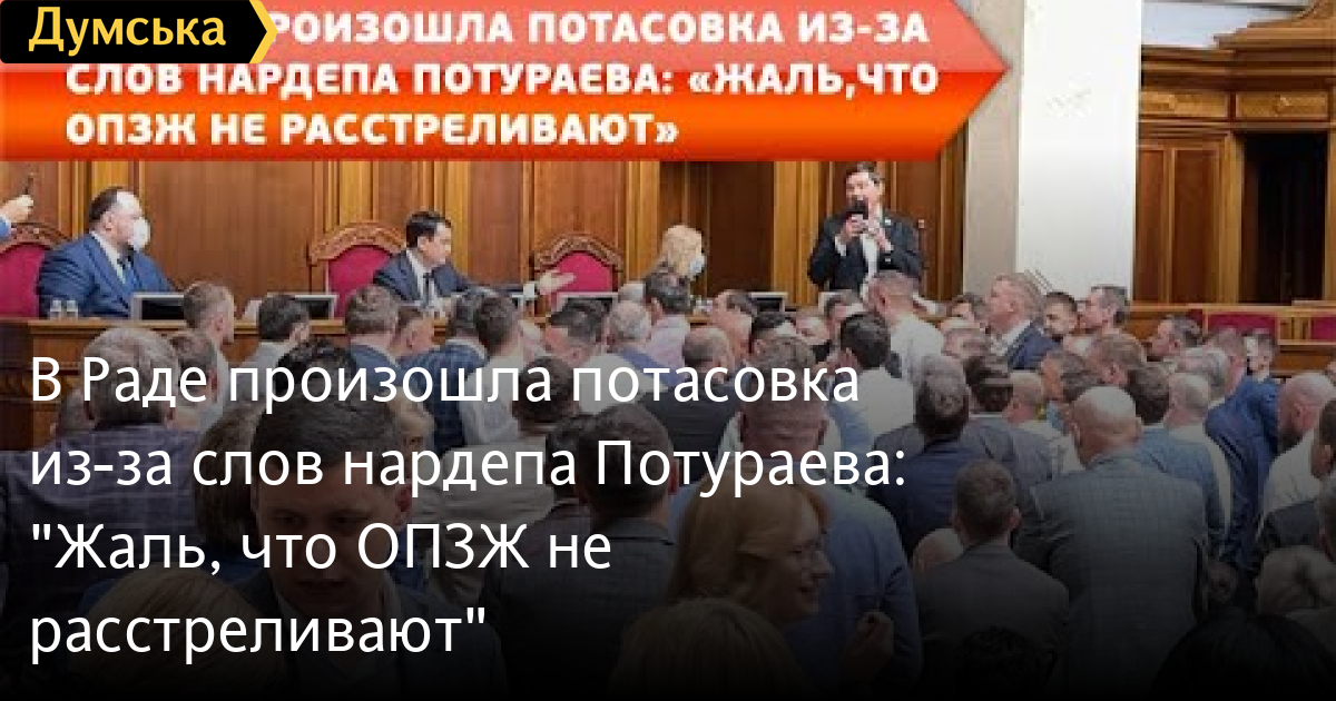Столкновение произошло во время рассмотрения законопроекта о реформе Национального совета по вопросам телевидения и радиовещания. Выступая, Потураев заявил, что «жалеет, что ОПЗЖ не расстреливают, а придется уничтожать их политически». После этих слов фракция ОПЗЖ подошла к трибуне и начала выяснять отношения со «слугой народа», после чего между ними произошла потасовка. СМЕРТЬ РОССИЙСКИМ ОККУПАНТАМ! Заметили ошибку? Выделяйте слова с ошибкой и нажимайте control-enter Думская ТВ. Сюжеты: