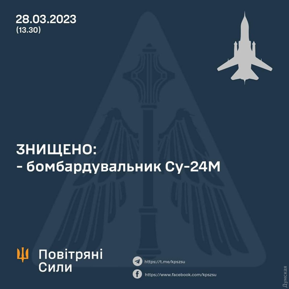 У районі Бахмута українська ППО збила ворожий бомбардувальник (оновлено)ППО Сил оборони України збила ворожий фронтовий бомбардувальник Су-24М у районі Бахмута. Повітряні сили Збройних сил України повідомили, що ціль було уражено близько 13:30 28 березня — знадобився час для підтвердження знищення літака. ОНОВЛЕНО О 12:10. Повітряні сили уточнили час знищення ворожого літака — його збили 29 березня о 1:30. СМЕРТЬ РОСІЙСЬКИМ ОКУПАНТАМ! Помітили помилку? Виділяйте слова з помилкою та натискайте control-enter |