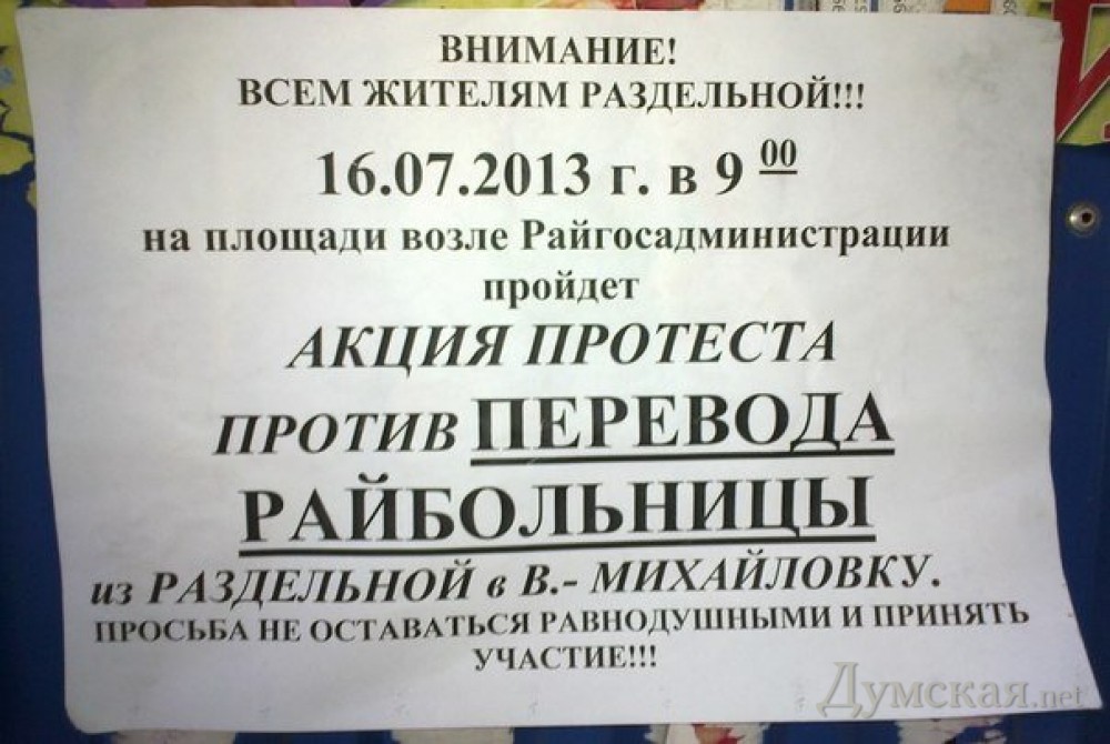 В Раздельной собирают митинг против переноса районной больницы: в РГА называют это провокациейНа днях в СМИ появилась информация о том, что 16 июля в городе Раздельная Одесской области на площади перед райгосадминистрацией состоится акция протеста против переноса районной больницы в Великомихайловку. Организаторы акции даже выпустили листовки с призывом к горожанам прийти на митинг и не допустить переноса больницы. В то же время глава Раздельнянской райгосадминистрации Олег Кураков сообщил «Думской», что эта акция является провокацией, за которой стоит главврач больницы. «Это провокация главврача ЦРБ Игоря Бычкова. У него заканчивается рабочий контракт, и его продолжать мы не намерены. Уже есть уголовное дело за взятку, которое находится в прокуратуре. Врач пытается всеми силами удержаться на посту, пытаясь сорвать сессию, дезинформируя население информацией о переносе райбольницы. На самом деле, у нас даже не стоит вопрос о ее какой-либо реорганизации», — заявил глава РГА. СМЕРТЬ РОСІЙСЬКИМ ОКУПАНТАМ! Помітили помилку? Виділяйте слова з помилкою та натискайте control-enter |