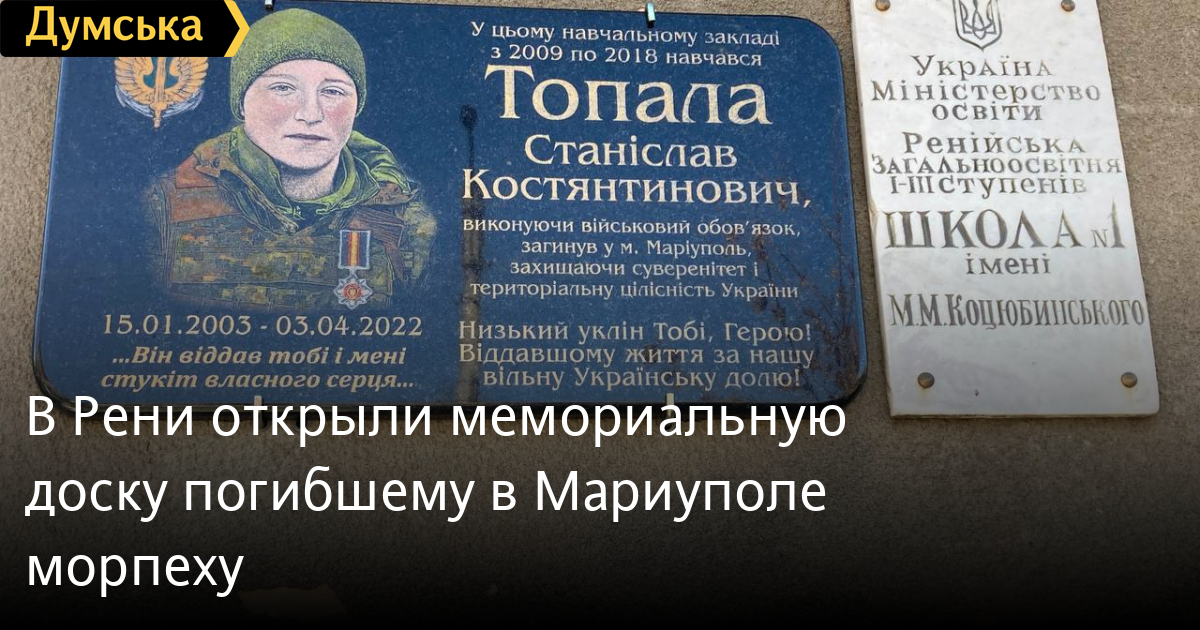 У Рені відкрили меморіальну дошку морпіху, який загинув у МаріуполіУ Рені увічнили пам'ять 19-річного земляка Станіслава Топала, який загинув 3 квітня, захищаючи Маріуполь. У міській раді повідомили, що дошку встановили на фасаді школи №1, яку закінчив загиблий герой. У відкритті дошки взяли участь родичі воїна, учні школи, представники ветеранських громадських організацій та місцевого самоврядування. Вічна слава і памʼять герою! СМЕРТЬ РОСІЙСЬКИМ ОКУПАНТАМ! Помітили помилку? Виділяйте слова з помилкою та натискайте control-enter |