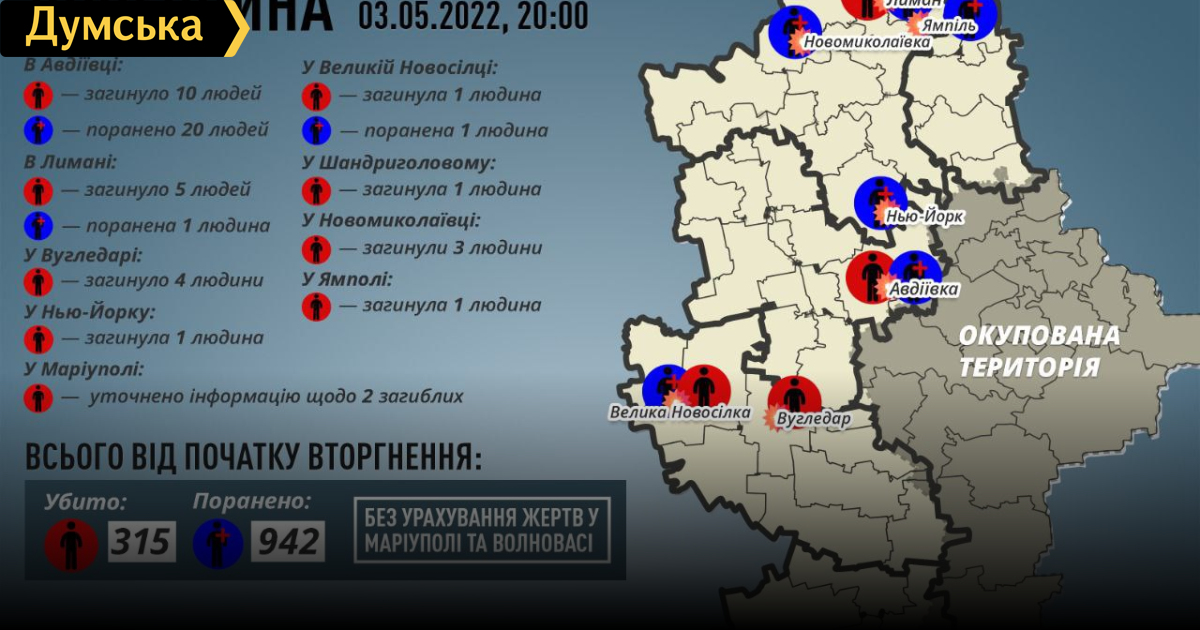 В результате вражеских обстрелов Донецкой области за сутки погиб 21 мирный житель, 27 получили раненияВ результате обстрелов оккупантами населенных пунктов Донецкой области 3 мая погиб 21 мирный житель, 27 получили ранения. Об этом сообщил глава Донецкой ОВА Павел Кириленко. По его словам, это самое большое количество жертв за один день с момента ракетного удара по железнодорожному вокзалу в Краматорске 8 апреля. Сегодня 10 человек погибли в Авдеевке, пятеро в Лимане, четверо в Угледаре, один в Большой Новоселке и один в Шандриголовом. Также удалось уточнить информацию о двоих погибших в Мариуполе, однако точное число погибших и раненых в Мариуполе и Волновахе установить невозможно. СМЕРТЬ РОСІЙСЬКИМ ОКУПАНТАМ! Помітили помилку? Виділяйте слова з помилкою та натискайте control-enter |