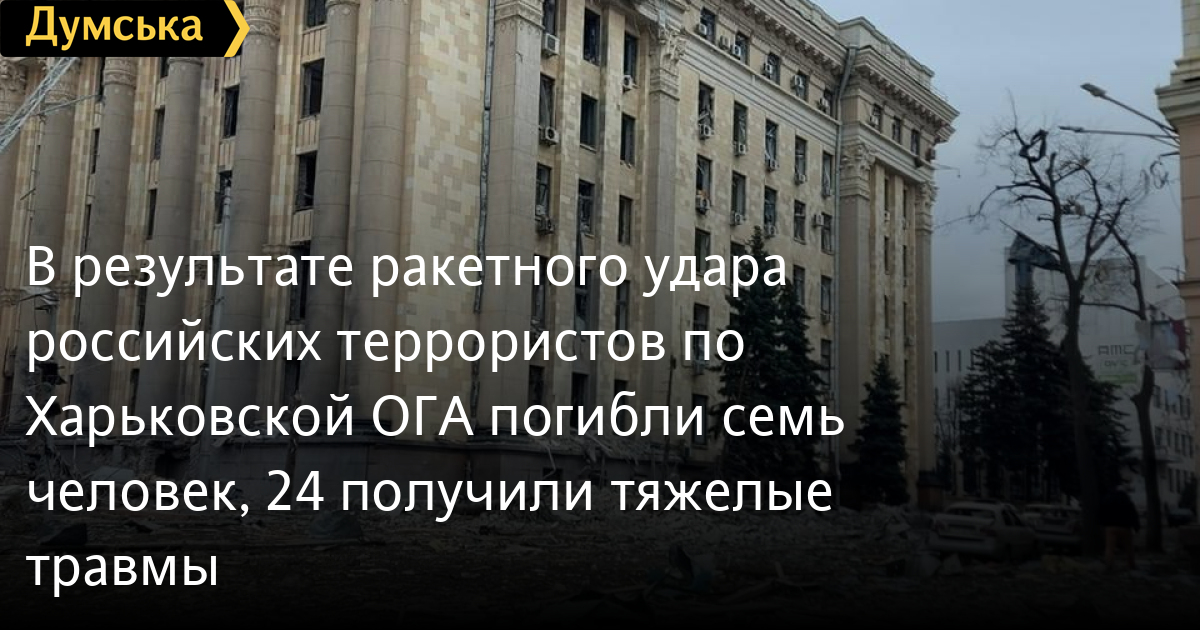 В результате ракетного удара российских террористов по Харьковской ОГА погибли семь человек, 24 получили тяжелые травмыВ результате ракетного удара вражеских войск по зданию Харьковской облгосадминистрации погибли семь человек и 24 получили тяжелые травмы. Как сообщают в Национальной полиции Украины, список жертв, увы, может быть не окончательным, так как спасательные работы по разбору завалов еще продолжаются. Напомним, утром 1 марта захватчики из РФ нанесли два удара крылатой ракетой класса «Калибр» по центральной площади Харькова. В результате вражеского нападения треть здания обрушилась. Также пострадали и все соседние здания. На месте работают следователи Харьковского районного управления полиции №3 ГУНП в Харьковской области — собирают вещественные доказательства и устанавливают обстоятельства преступного нападения. Открыто уголовное производство по части 2 ст. 438 (нарушение законов и обычаев войны) Уголовного кодекса Украины. СМЕРТЬ РОССИЙСКИМ ОККУПАНТАМ! Заметили ошибку? Выделяйте слова с ошибкой и нажимайте control-enter |