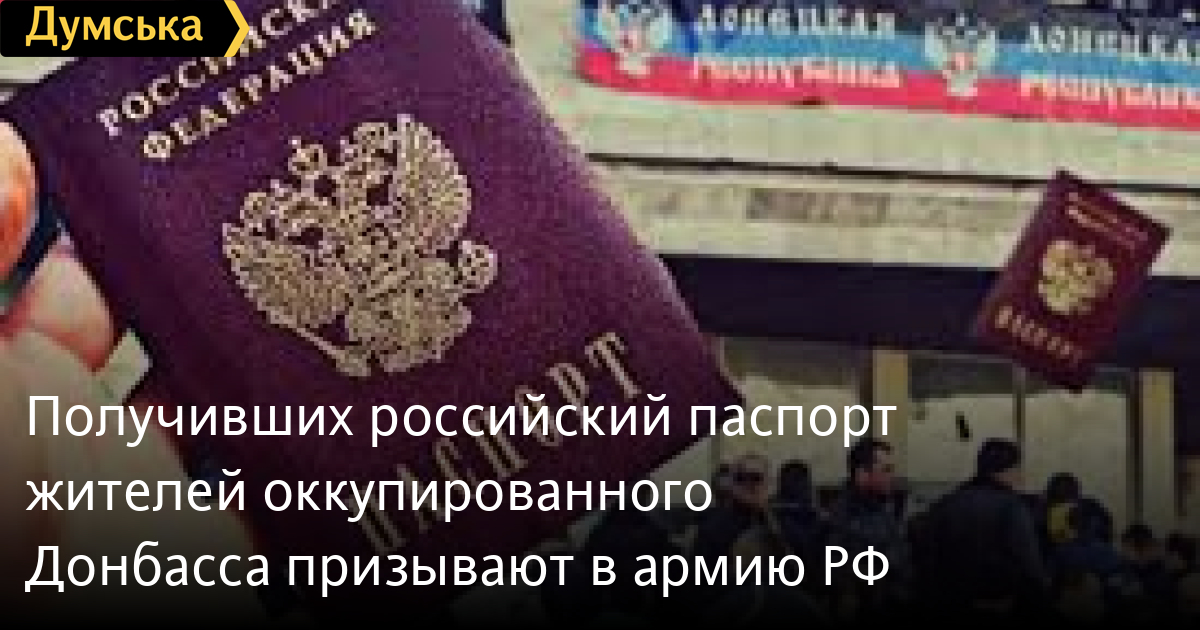 Получивших российский паспорт жителей оккупированного Донбасса призывают в армию РФРоссийская Федерация начала призывать жителей отдельных районов Донецкой и Луганской областей (ОРДЛО) в свою армию. Призывают мужчин с российскими паспортами. Как сообщает «РБК-Украина», об этом на пресс-конференции заявил представитель уполномоченного Верховной Рады по правам человека в Донецкой и Луганской областях Павел Лисянский. По его словам, с 2019 года Россия раздает на оккупированном Донбассе свои паспорта. «И сейчас там наращивается потенциал выдачи этих паспортов. И уже, как мне докладывают правозащитники, есть граждане, которые получили российские паспорта и которых призывают в Вооруженные силы Российской Федерации», — заявил Лисянский. По его словам, у жителя ОРДЛО с российским паспортом нет права на российскую пенсию, но зато есть обязанность служить в армии. СМЕРТЬ РОССИЙСКИМ ОККУПАНТАМ! Заметили ошибку? Выделяйте слова с ошибкой и нажимайте control-enter |