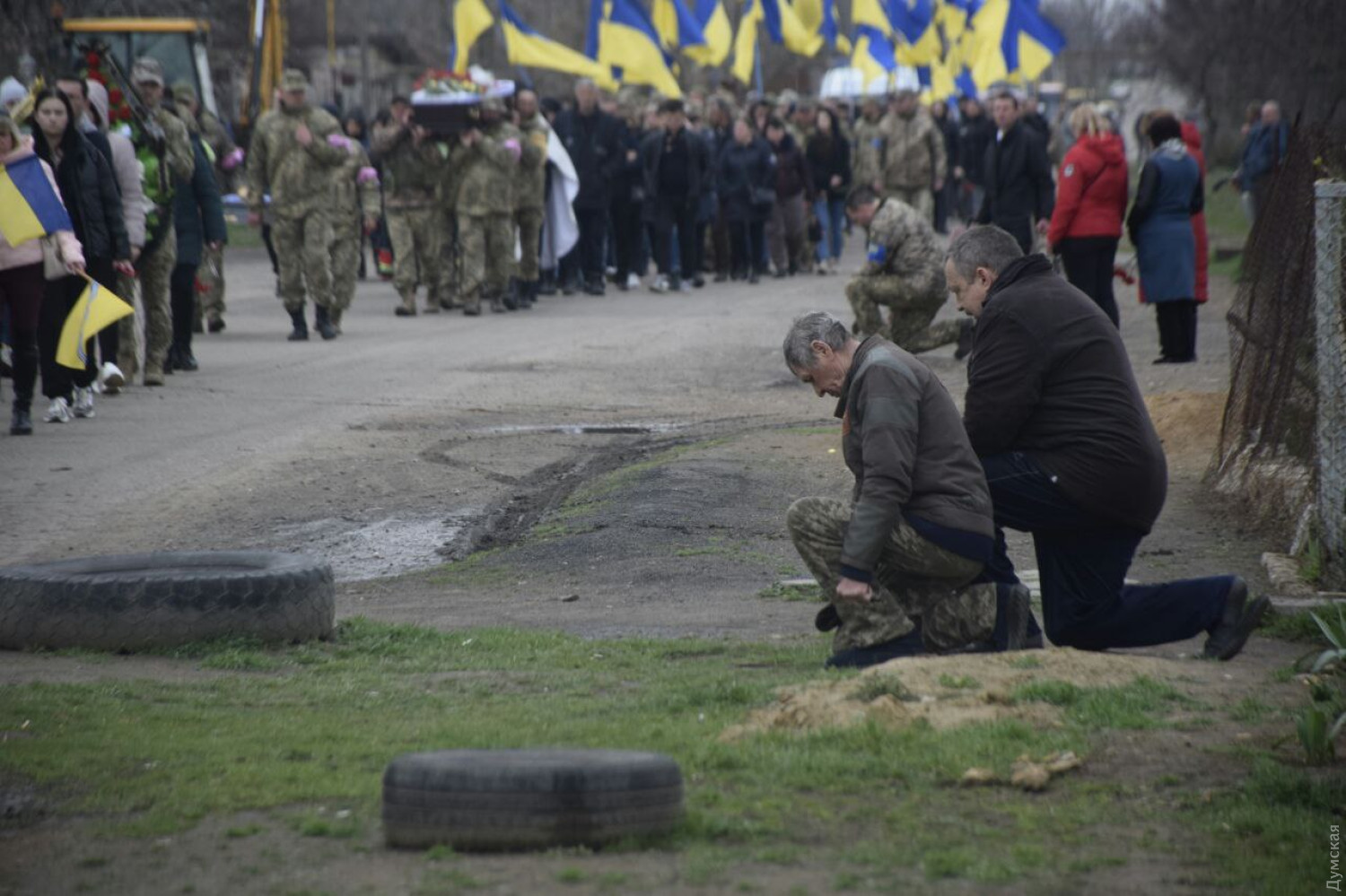 Люди прощались с погибшим, преклонив колени.