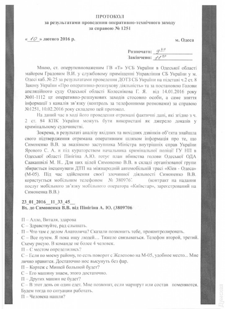 В Сети появилась фальшивая стенограмма переговоров одесских полицейских: они якобы готовили покушение на СаакашвилиСайт «Корреспондент» обнародовал сканы некоего «документа СБУ», якобы свидетельствующего о подготовке высшим руководством МВД и одесского облуправления полиции покушения на губернатора Михаила Саакашвили. Бумага датирована 10 февраля сего года и озаглавлена как «протокол о результатах оперативно-технического мероприятия». В ней содержится расшифровка телефонных переговоров начальника одесского уголовного розыска Андрея Пинигина и главы Великомихайловского РОВД Виталия Симоненко, которые якобы обсуждали детали задуманного ими убийства главного реформатора. При этом автор документа утверждает, что «операцию» им заказал замминистра внутренних дел Сергей Яровой. Мы попросили прокомментировать «слив» «Корреспондента» одного из фигурантов «протокола» — Андрея Пинигина: «Это какой-то бред, — заявил офицер «Думской». — Я всегда был вне политики, никогда ею не занимался и не буду заниматься. Фальшивка сделана настолько топорно, что заставляет усомниться в психической адекватности ее создателей. Возможно, я кому-то помешал». И действительно, ляпы авторов слива видны невооруженным взглядом. Скажем, во вступлении есть ссылка на часть 2 статьи 8 Закона Украины «Об оперативно-розыскной деятельности», которая дает следователю право производить оперативную закупку. «Прослушка» регламентируется другой нормой. Не очень понятно, как должен был начальник Великомихайловского РОВД организовывать что-то на территории чужого района: село Желепово относится к Беляевскому району, а Радостное — в Ивановском. В описательной части документа и расшифровке указаны два разных телефона Пинигина. Хорошо прокомментировал эту писульку блогер «Думской», сотрудник областного бюро судебной медицины Борис Яворский: «Из живых посетителей нашего гостеприимного заведения в число наиболее интересных объектов наблюдения входят, конечно, менты и жулики. Ладно, сотрудники уголовного розыска и лица, род деятельности которых предосудителен с точки зрения уголовного законодательства. И одна из особенностей поведения, совершенно аналогичная у этих двух категорий населения – это манера разговора по телефону. Опытный жулик всегда держит в голове, что его могут слушать менты; толковый опер-розыскник никогда не забывает, что его может слушать вся Бебель-стрит, от увебешников до ребят из-под елочек. Поэтому в случае хоть сколько-нибудь скользкой темы что у тех, что у других, реплики начинают звучать примерно так: – Слушай, дорогой… Я по твоему вопросу был там, ну, ты понял, где наш друг тогда этого видел, ага… Да, я говорил с тамошними, они согласны сделать, как мы с тобой хотели… А те жуки, ну ты понял, которые не эти, они не будут возражать… Да, они хотят трошки больше… Ну, раза в полтора от того, как эти им тогда давали… Я, собственно, это все к чему рассказываю? Когда я вижу «стенограмму телефонного разговора», в которой начальник угрозыска, полковник милиции, самый что ни на есть матерый опер в ходе подготовки к совершению тяжкого преступления произносит слова «кортеж с Мишей», а потом, чисто для уточнения, дополняет про «губернатора», – даже если не задумываться о множестве прочих грубых ляпов в истории с «покушением», становится нем