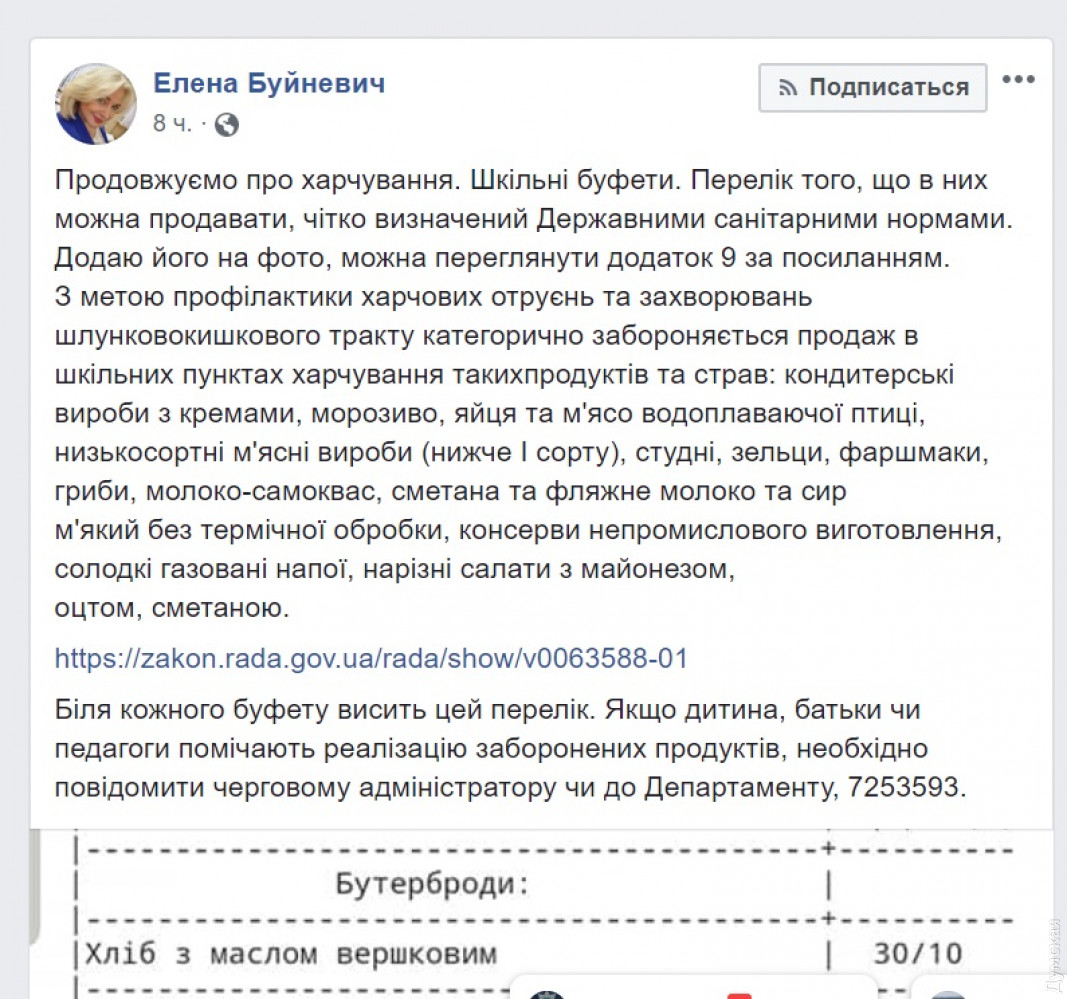 В школьных столовых Одессы вывесили списки запрещенных продуктов: среди них — форшмак и сладкая газировкаВ одесских школах появились списки продуктов, продажа которых в столовых учебных заведений запрещена. Об этом сегодня сообщила директор департамента образования и науки Одесского горсовета Елена Буйневич. По ее слова, запрет введен с целью профилактики пищевых отравлений и заболеваний желудочно-кишечного тракта. Так, в школьных пунктах питания категорически запрещается продажа следующих продуктов и блюд: кондитерские изделия с кремами; мороженое; яйца и мясо водоплавающей птицы; низкосортные мясные изделия (ниже I сорта); студни, зельцы; фаршмак; грибы; молоко-самоквас; сметана, фляжное молоко и мягкий сыр без термической обработки; консервы непромышленного изготовления; сладкие газированные напитки; нарезные салаты с майонезом, уксусом, сметаной. «Если ребенок, родители или педагоги замечают реализацию запрещенных продуктов, необходимо сообщить дежурному администратору или в департамент», — отметила чиновник. Также Елена Буйневич опубликовала определенный санитарными нормами перечень разрешенных продуктов. Салаты в нем значатся заправленные маслом, а из сладкого — печенье, вафли, зефир и булочки. Напомним, в рамках реформы школьного питания мэрия планирует заменить булочки запеканками. СМЕРТЬ РОСІЙСЬКИМ ОКУПАНТАМ! Помітили помилку? Виділяйте слова з помилкою та натискайте control-enter