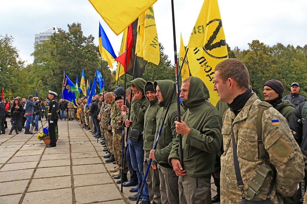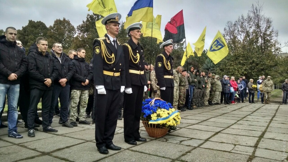 Тут вы не правы. Это городское мероприятие. Мемориал сооружается по решению горисполкома. И флаги города вместе с государственными вполне уместны: http://omr.gov.ua/ru/acts/council/73439/ http://omr.gov.ua/ru/acts/committee/83959/