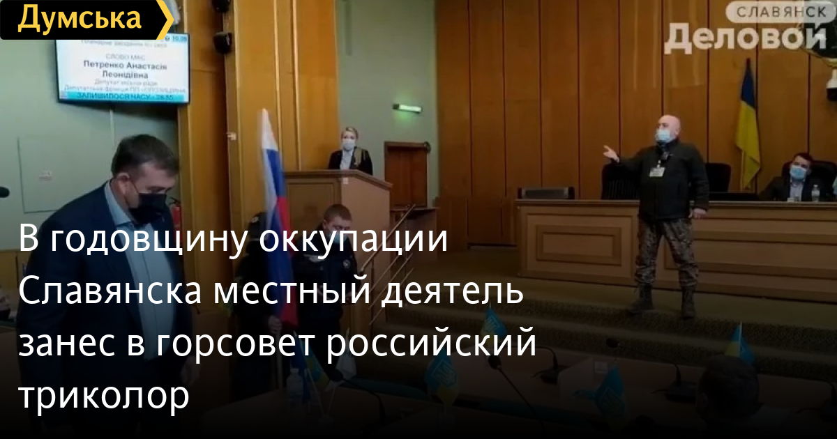 В годовщину оккупации Славянска местный деятель занес в горсовет российский триколорВ Славянске в годовщину оккупации города российскими террористами в сессионный зал горсовета занесли флаг России. Как сообщает в Твиттере «Highlander Freeman», флаг внес в зал местный активист — он прикрыл его флагом Украины, после чего развернул триколор. Местное издание «Деловой Славянск» сообщает, что флаг на сессию занес местный активист Василий Хоменко — якобы он хотел привлечь внимание к продолжающимся военным действиям на востоке страны, для того, чтобы ситуация 2014 года не повторилась в Славянске в будущем. Спустя несколько минут в зале появились представители полиции, которые вынесли флаг РФ из сессионного зала, а на активиста составили протокол о нарушении.