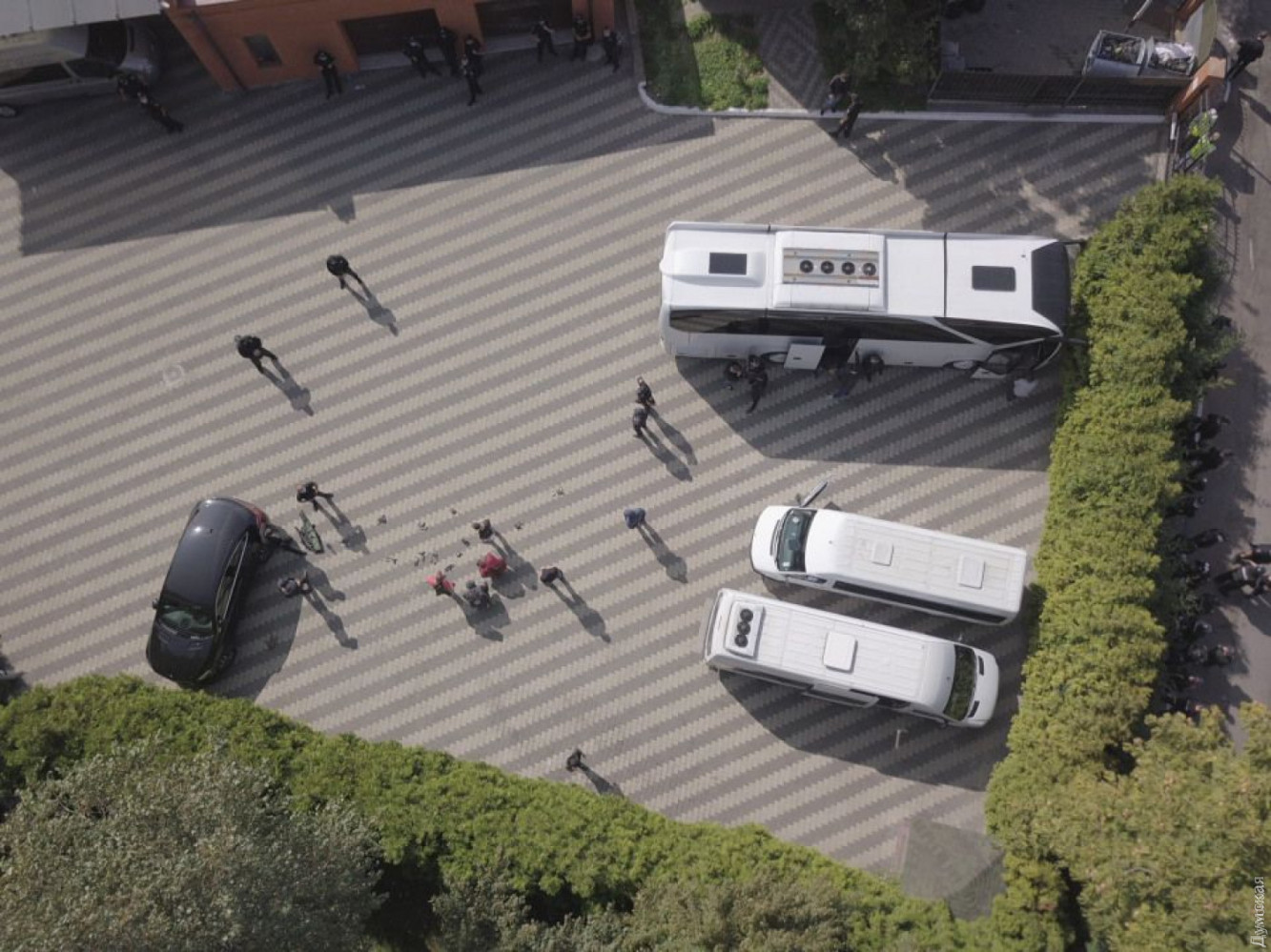 Задержанные были вооружены травматическим и боевым оружием. Их окружили полицейские, вынудив выйти из пансионата и сесть в подогнанные автобусы, которые отвезли титушек в райотдел.