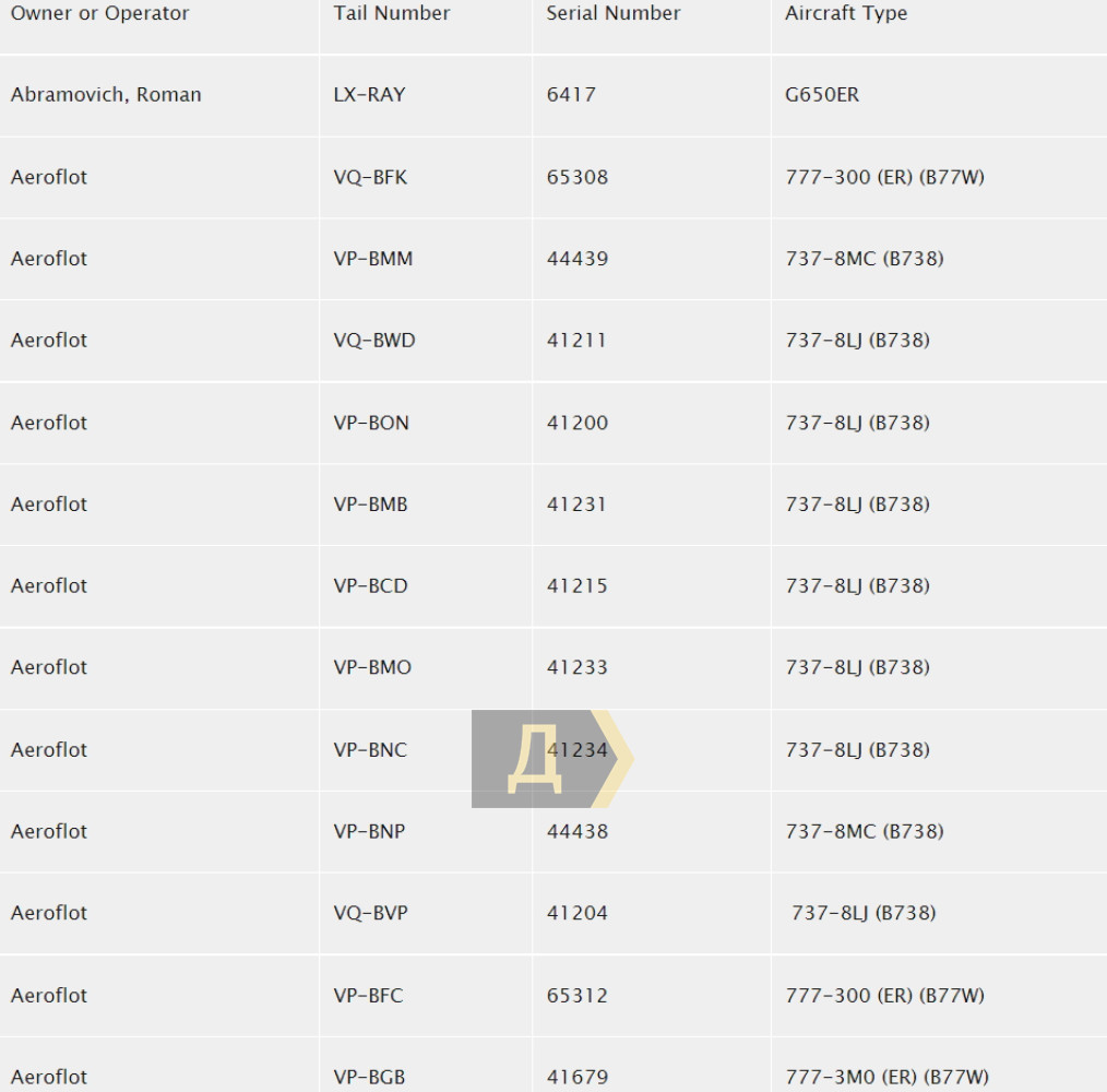 В черный список американского ведомства вошли 33 борта авиакомпании «Аэрофлот», 12 самолетов Air Bridge Cargo Airlines, 23 Azur Air, 14 Nordwind, 12 Utair, 5 «Авиастар-Ту», а также личный самолет олигарха Романа Абрамовича.