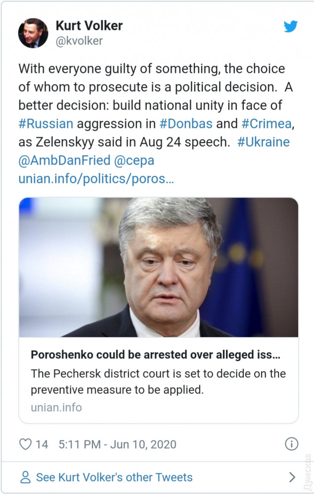 Как заявил Курт Волкер в своем Твиттере, на фоне российской агрессии Зеленскому лучше бы сконцентрироваться на построении сильного государства, а не на преследовании оппозиции.