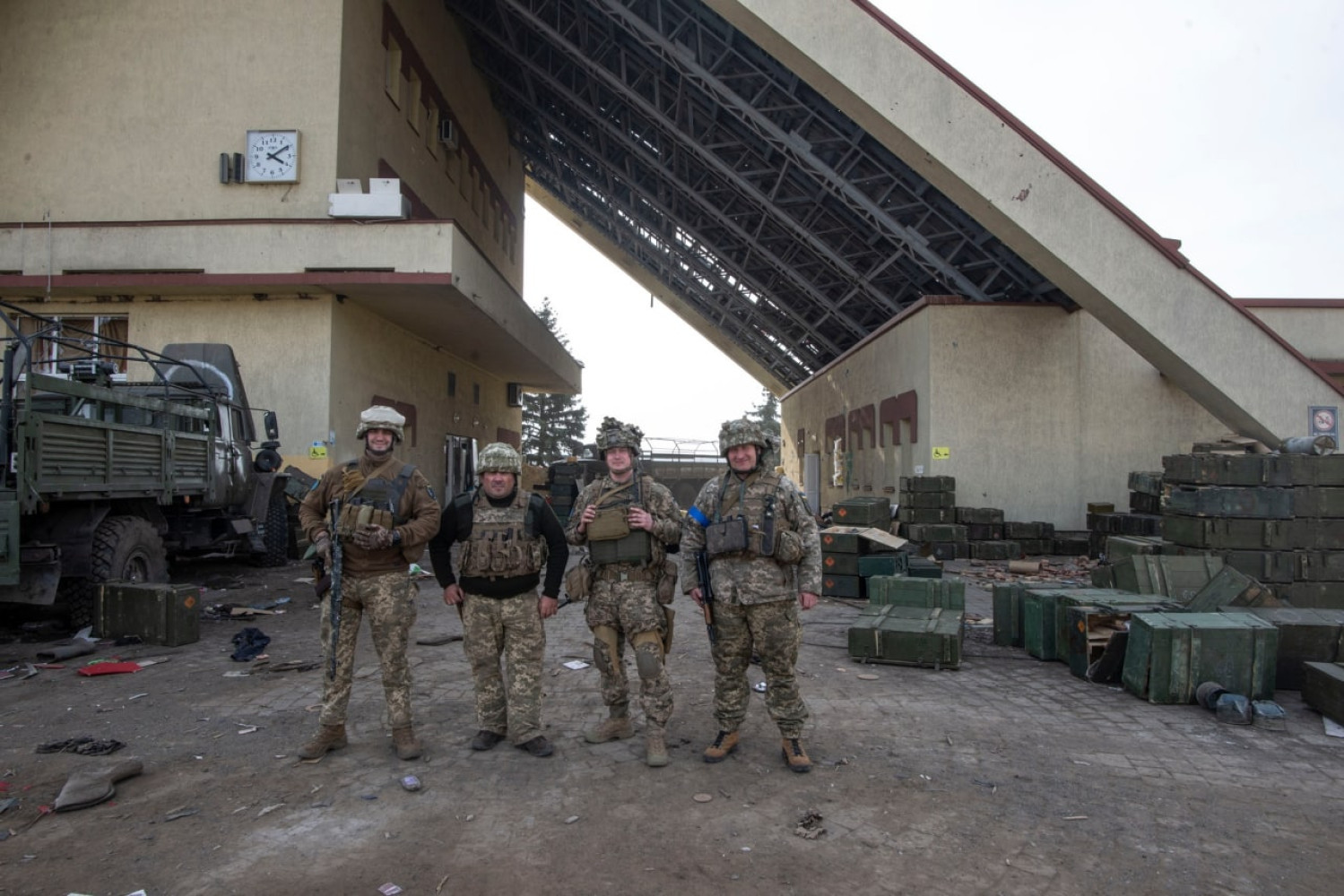 В этом помещении был пожар вследствие атаки. Спасатели до сих пор проливают.