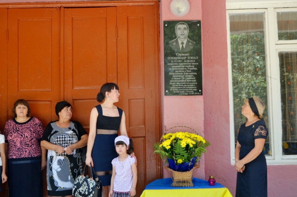 Мемориальную доску в честь погибшего сержанта 28-й отдельной механизированной бригады Александра Топала открыли в райцентре Тарутино в минувшие выходны Мемориальную доску из черного полированного гранита установили у входа в центральный корпус Тарутинской школы, в которой учился погибший боец. Как сообщает информагентство «Трасса Е-95», на митинг-реквием пришли родственники и друзья Александра Топала, а также исполняющий обязанности главы Тарутинской районной администрации Анатолий Серек-Басан и поселковый голова Иван Куруч. Представители власти произнесли короткие речи, отметив подвиг бойца и пообещав поддержку его семье. Работники районного Дома культуры представили музыкально-поэтическую композицию, в ходе которой подробно рассказали о мирной жизни Александра и его боевом пути. Право снять флаг Украины с мемориальной доски и таким образом открыть ее было предоставлено вдове погибшего сержанта Любови Топал. После этого собравшиеся возложили цветы к мемориальному знаку. Александр Топал родился 21 декабря 1981 года в поселке Тарутино. Учился в местной школе. В 2000 году был призван в армию. С 2002-го служил в Тарутинском райотделе милиции. Затем несколько лет работал в частных структурах. В 2013 году вернулся в армию, но уже по контракту. В зону проведения АТО его часть попала 7 ноября 2014 года. В звании сержанта Александр Топал был командиром боевой машины, руководил механизированным отделением 28-й ОМБР. 16 августа 2014 года позиции бригады близ села Благодатное Волновахского района Донецкой области были подвергнуты массированному артобстрелу с использованием систем реактивного залпового огня «Град». В результате погибли 5 украинских военнослужащих, среди которых был и Александр Топал. Боец похоронен на кладбище в Тарутино. У него остались жена и двое маленьких детей – мальчик и девочка. СМЕРТЬ РОСІЙСЬКИМ ОКУПАНТАМ! Помітили помилку? Виділяйте слова з помилкою та натискайте control-enter |