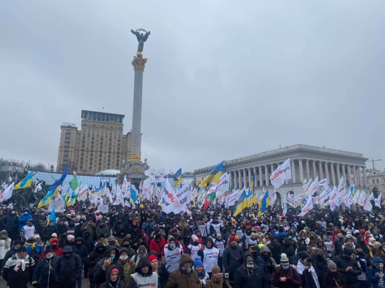 Тысячи предпринимателей вышли сегодня днем на Майдан в Киеве, чтобы провести очередную акцию протеста против запрета на работу бизнеса во время ужесточения карантина в стране с 8 по 24 января 2021 года. Лидеры протестующих ФОПов говорят, что не собираются сдаваться и готовы к различным сценариям развития событий, включая силовой. Они призывают предпринимателей в микрофон продолжать борьбу за создание нормальных условий работы для малого бизнеса. Если власть их не услышит они готовы даже к привлечению праворадикальных сил.