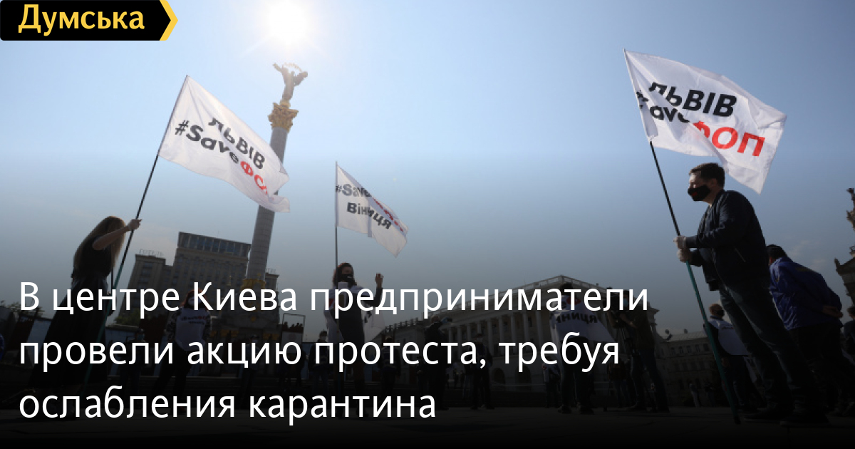 В центре Киева предприниматели провели акцию протеста, требуя ослабления карантинаПредставители малого бизнеса провели акцию протеста под зданием Офиса президента с требованием ослабить карантин и разрешить им работать. Изначально люди собрались на Майдане, но затем переместились под ОП. В акции под лозунгом #SaveФОП приняли участие предприниматели из разных городов Украины — Львова, Харькова, Чернигова, Винницы, Мукачево, Хмельницкой области, пишет РБК. Все они жаловались на то, что из-за карантина остались без средств к существованию. Митингующие требовали разрешить работу малому бизнесу, а также – упростить систему налогообложения для предпринимателей.