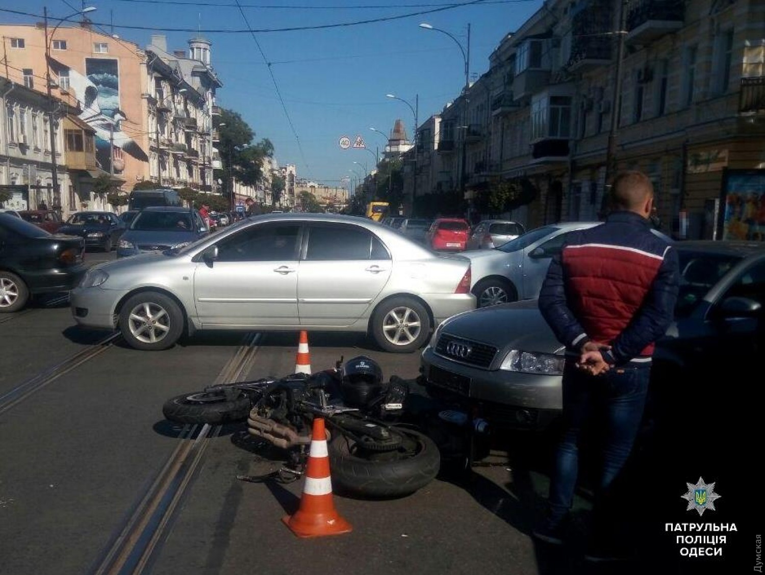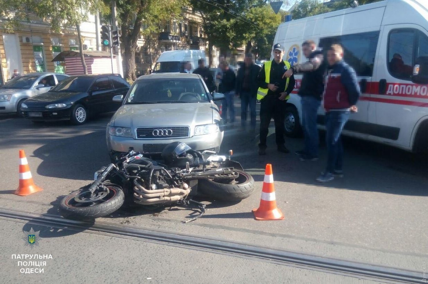 Сегодня около 14 часов в центре Одессы случилась авария с участием мотоцикла. По предварительной информации патрульной полиции, водитель автомобиля «Ауди», выполняя поворот налево с улицы Успенской на Тираспольскую, не убедился в безопасности маневра и совершил столкновение с мотоциклом Yamaha, который двигался во встречном направлении со стороны Дегтярной.