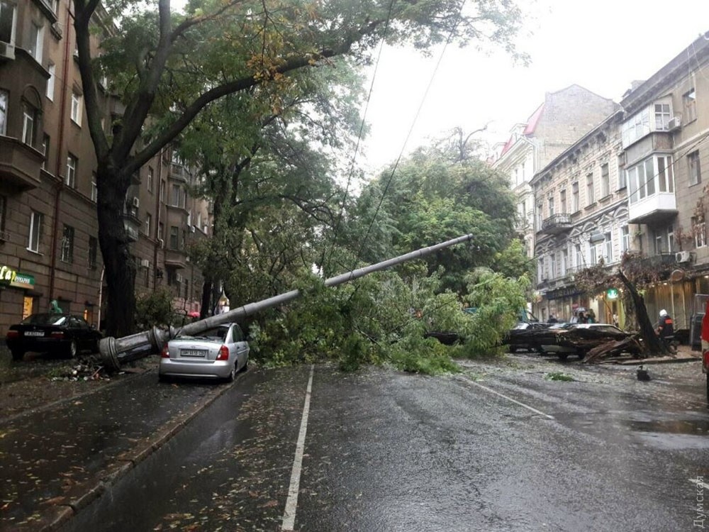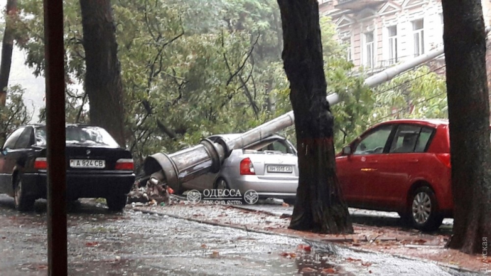 «Между Ришельевской и Пушкинской упало дерево и зацепило столб. Столб упал на припаркованную машину и перекрыл дорогу», — сообщил очевидец.