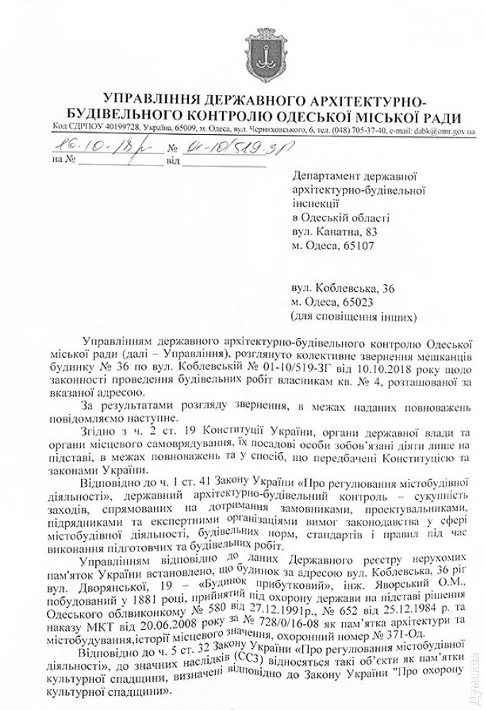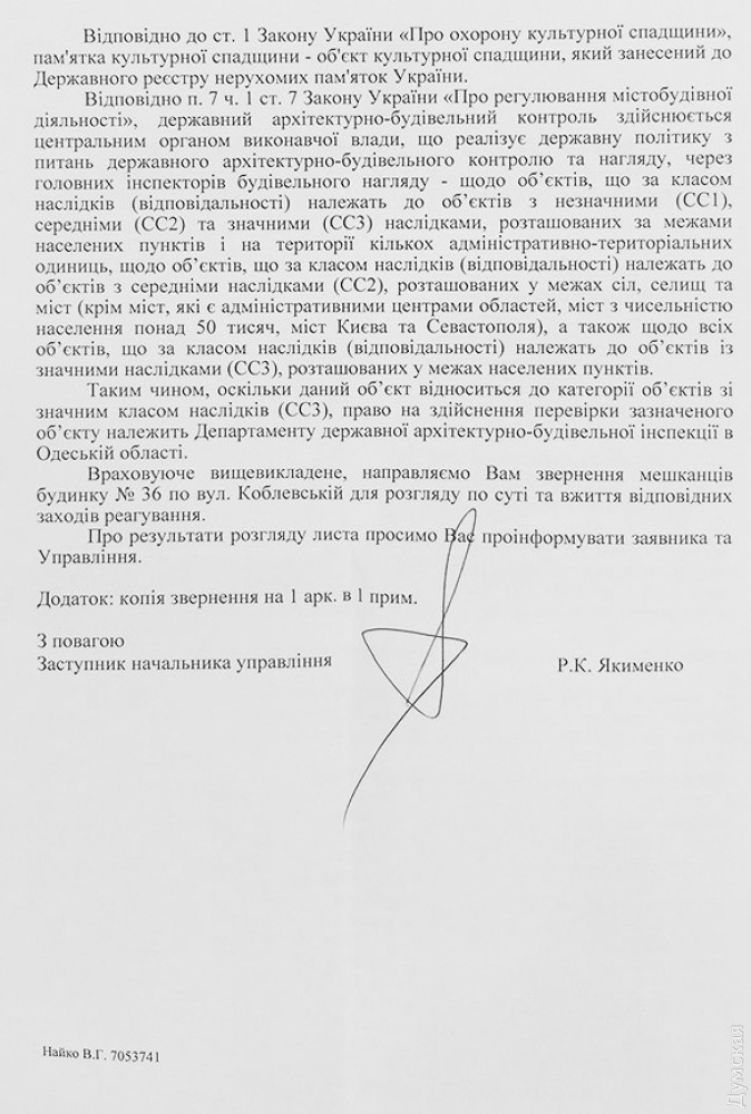 Жильцы памятника архитектуры в центре Одессы опасаются появления нелегальной мансардыЖильцы дома на Коблевской, 36, который является памятником архитектуры местного значения, опасаются, что под видом ремонтных работ в квартире на третьем этаже здание «украшают» мансардой. Этот дом также известен тем, что в нем в свое время жили микробиолог, профессор Александр Безредка, работавший в Пастеровском институте Парижа, а также микробиолог, бактериолог, создатель противочумной и противохолерной вакцин, лауреат Нобелевской премии Владимир Хавкин. Как рассказали «Думской» жильцы, недавно в квартире №4 на верхнем этаже затеяли капитальный ремонт, да такой активный, что в коммуналке снизу посыпалась штукатурка. «Что они там делают, мы не знаем, хозяина не видели, а рабочие говорили, что просто ремонт, но у нас в комнатах с потолка отваливается лепка», — возмущается жительница дома Елена. Более того, несколько недель назад ремонтные работы переместились на чердак, где пространство над квартирой очистили до деревянных перекрытий. До этого общественный вход на чердак закрыли, а отчищенную на чердаке территорию оградили сеткой. «Когда работы переместились на чердак, мы вызвали коммунальщиков, те пришли и сказали, что там просто очищают помещение от мусора, — рассказывает другой сосед Александр. — Но боюсь, что эта очистка выльется в появление мансарды». Так или иначе, уже известно, что кроме уборки мусора, рабочие заменили на чердаке металлические трубы на пластиковые меньшего диаметра. «Как себя поведет эта переделка во время запуска отопления, мы не знаем. Не знаем, кого спрашивать, если трубы порвет. Согласований, разрешений нам никто не показал, а как только начали обращаться во все инстанции о незаконных работах, все работы прекратились и рабочие исчезли», — сетует Александр. Жильцы еще выясняют, кому сейчас принадлежит ремонтируемая квартира — знают, что платежки за коммуналку приходят на некого Шумковского В.В. Согласно официальному ответу управления государственного архитектурного строительного контроля Одесского горсовета, дом на Коблевской, 36 - это доходный дом инженера Яворского О.М., построенный в 1881 году. Он взят под охрану государства по решению облисполкома от 27.12.1991. Является памятником архитектуры (охранный номер 371-Од). В связи с тем, что памятнику присвоена категория СС3, ГАСК перенаправил обращение жильцов в департамент государственной архитектурно-строительной инспекции в Одесской области, от которого жильцы ответа еще не получили. Люди также написали обращение на имя мэра города Геннадия Труханова, однако ответа пока нет. Фото — Андрей Колисниченко СМЕРТЬ РОСІЙСЬКИМ ОКУПАНТАМ! Помітили помилку? Виділяйте слова з помилкою та натискайте control-enter |