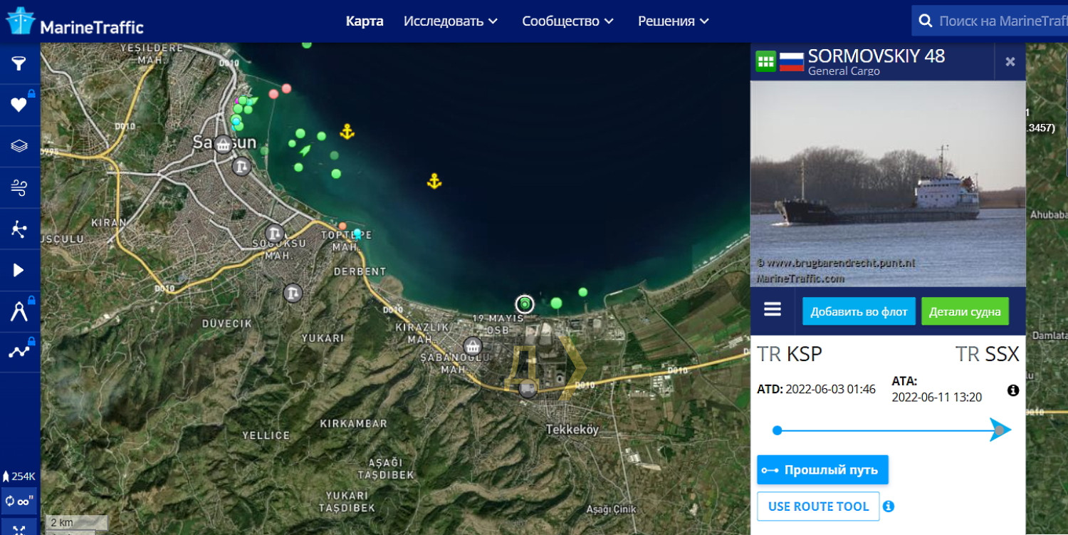 У одного из причалов порта Самсун сейчас стоит под разгрузкой российский сухогруз Сормовский-48 (IMO 8226428), передает корреспондент «Думской».