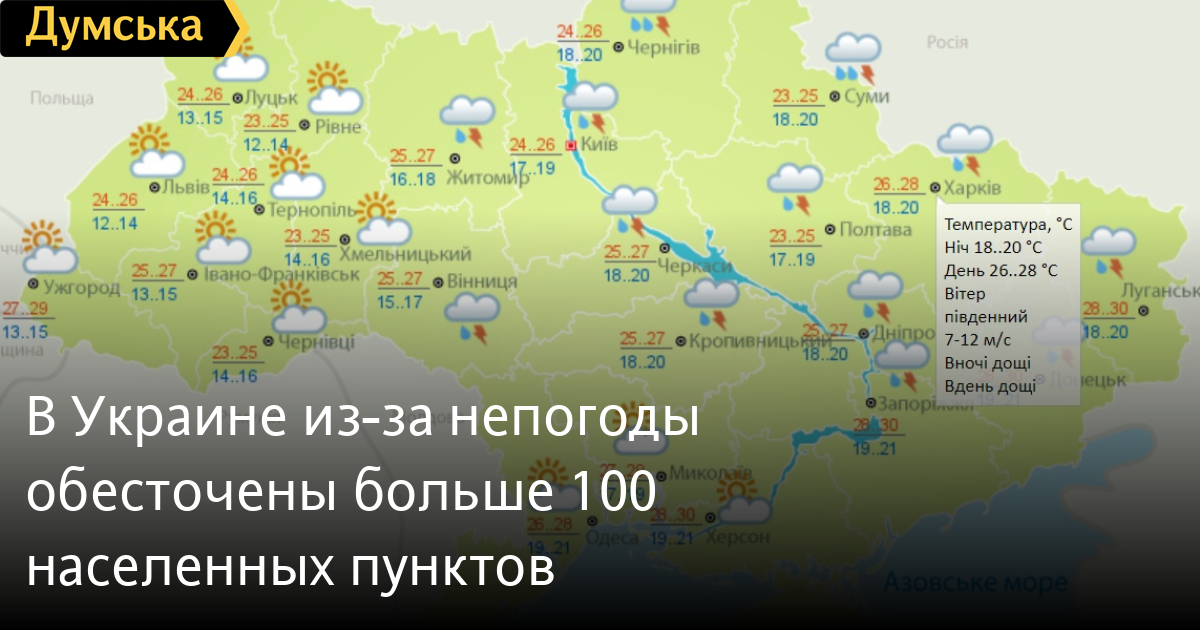 Об ухудшении погодных условий на территории Украины предупреждают синоптики. По данным пресс-центра ГСЧС, в понедельник, 28 июня, ожидаются грозы, град и сильный ветер на большей части страны, кроме южных областей. В восточных регионах синоптики прогнозируют град и сильный ветер до 15-20 метров в секунду. В Киеве и области ожидаются грозы. Температура воздуха по Украине составит в среднем +24-26 градусов. В восточных и южных областях температура повысится до +30 градусов. При этом бушевавшая накануне непогода уже обесточила 109 населенных пунктов в шести областях. По состоянию на 7 часов 28 июня в Сумской области обесточены 37 населенных пунктов, Днепропетровской — 33, Донецкой — 13, Запорожской — 12, Киевской — 7 и Черниговской – 7. К восстановлению электроснабжения привлечены бригады облэнерго. СМЕРТЬ РОССИЙСКИМ ОККУПАНТАМ! Заметили ошибку? Выделяйте слова с ошибкой и нажимайте control-enter |