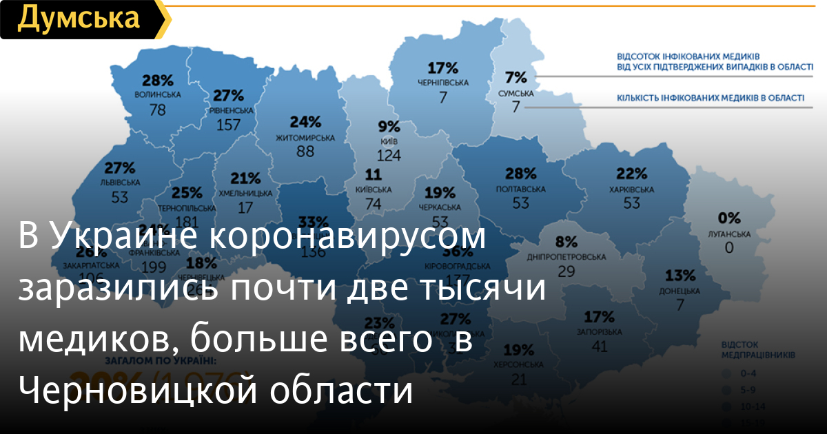 В Украине коронавирусом заразились почти две тысячи медиков, больше всего – в Черновицкой областиПо состоянию на 29 апреля в Украине заражение коронавирусной инфекцией подтверждено у 1976 медиков. Об этом сообщила пресс-служба Центра общественного здоровья МОЗ. Там отметили, что больше всего медицинских сотрудников заболело в Черновицкой области – 246 человек. «Однако в соотношении к общему количеству больных в области лидирует Кировоградская (36%), Винницкая (33%) и Волынская с Полтавской (по 28%) области», — отметили в ЦОЗ. В министерстве отмечают, что причинами заболевания медиков могут быть отсутствие четкого плана действий медицинского учреждения, нарушение определенного маршрута пациента и стандартов ведения пациентов, недостаточное обеспечение медперсонала необходимым средствами индивидуальной защиты, а также неправильное использование средств индивидуальной защиты, их сберегание и утилизация. Напомним, по состоянию на утро 29 апреля в Украине всего зарегистрировано 9866 заболевших. СМЕРТЬ РОССИЙСКИМ ОККУПАНТАМ! Заметили ошибку? Выделяйте слова с ошибкой и нажимайте control-enter Новости по этой теме: 4 марта 2023: "Вакцини-довгожителі", або Як щеплення проти COVID-19 перетворилися в Україні на небезпечний ритуал 27 января 2023: МОЗ обязали опубликовать договоры на закупку вакцин против COVID-19: апелляционный суд удовлетворил иск журналиста "Думской" 11 января 2023: За неделю в Одессе зафиксировано 159 случаев ковида 4 января 2023: За неделю в Одессе зарегистрировано 113 случаев ковида |
