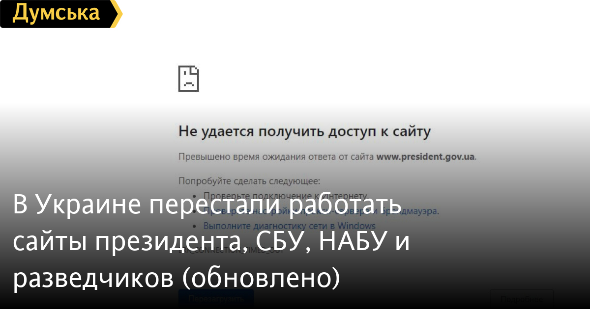 В Украине перестали работать сайты президента, СБУ, НАБУ и разведчиков (обновлено)Масштабный сбой в работе официальных сайтов государственных органов произошел в Украине. В настоящее время не работает сайт Офиса президента Украины, Службы безопасности Украины, Национального антикоррупционного бюро. Также невозможно перейти на страницы Службы внешней разведки и Государственной службы спецсвязи и защиты. Связана ли данная проблема с хакерской атакой, в ОП пока не комментируют. Как сообщили изданию РБК в киберполиции, сообщений об атаках на сайт президента к ним не поступало. «Возможно, идут плановые технические работы», — добавили в ведомстве. ОБНОВЛЕНО В 21:03. Сайты заработали. Что стало причиной неполадки — пока неизвестно. СМЕРТЬ РОССИЙСКИМ ОККУПАНТАМ! Заметили ошибку? Выделяйте слова с ошибкой и нажимайте control-enter |