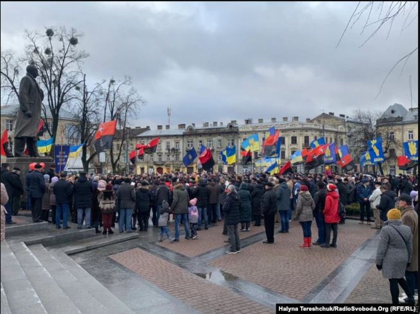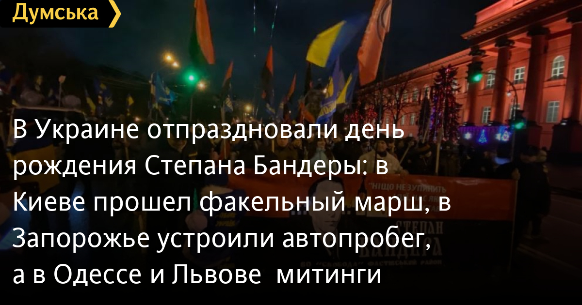 В Украине отпраздновали день рождения Степана Бандеры: в Киеве прошел факельный марш, в Запорожье устроили автопробег, а в Одессе и Львове – митинги1 января во многих украинских городах традиционно проводятся памятные мероприятия, посвященные дню рождения лидера ОУН, видного деятеля национального движения Степана Бандеры. В этом году исполнилось 113 лет со дня рождения Бандеры. Как сообщает «Радио Свобода», в честь праздника по центральным улицам Киева прошел факельный марш, в котором приняли участие несколько сотен человек. Марш начался в парке Тараса Шевченко, его конечной точкой стал Майдан Независимости, на котором состоялось вече. Участники акции предложили присвоить своему кумиру звания Героя Украины. В Запорожье в честь Степана Бандеры устроили автопробег — от центральной площади до железнорожного вокзала проехала колонна машин с красно-черными и государственными флагами. В Одессе состоялся митинг у памятника Тарасу Шевченко. Участники жгли факелы и пели «Батько наш Бандера, Україна мати». Подобное мероприятие состоялось и во Львове у памятника Степану Бандере. Там кроме кроме активистов присутствовали представители местных органов власти. СМЕРТЬ РОССИЙСКИМ ОККУПАНТАМ! Заметили ошибку? Выделяйте слова с ошибкой и нажимайте control-enter |