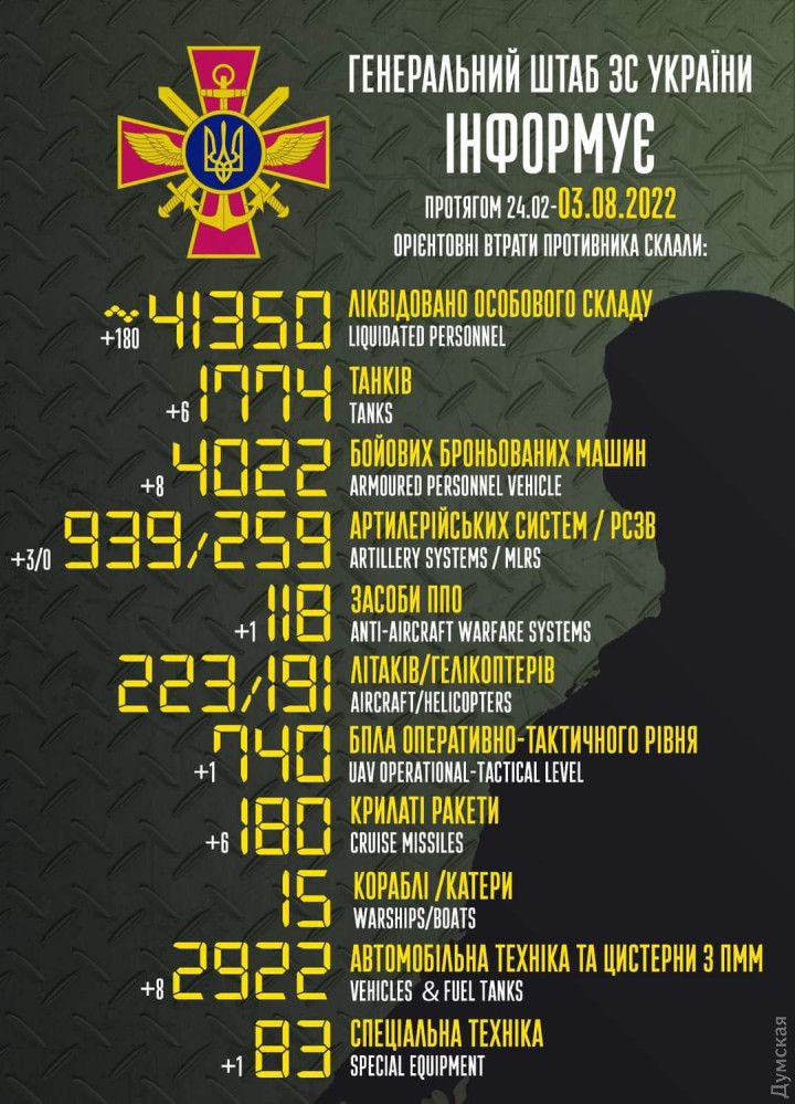Сили оборони України 2 серпня зменшили російську окупаційну армію на 180 солдатів та офіцерів. З початку повномасштабного вторгнення в Україну стало вже на 41350 рашистів менше. За даними Генерального штабу Збройних сил України, також минулої доби було підбито шість танків (1774), вісім бронемашин (4022), вісім вантажівок (2922) та одна одиниця спецтехніки (83).