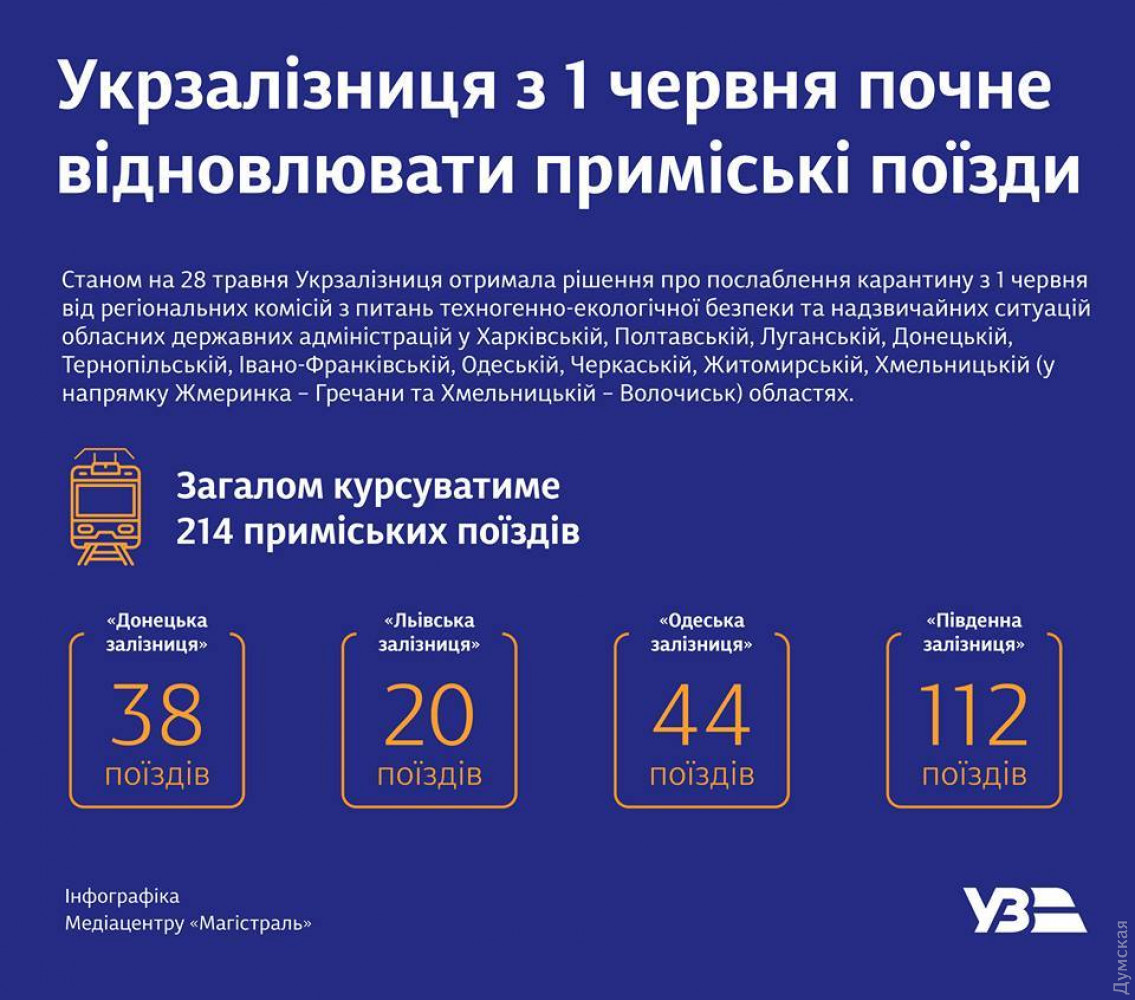 «Укрзалізниця» с 1 июня запускает 214 пригородных поездов в десяти областях Украины, где ослабили карантин. Речь о Харьковской, Полтавской, Луганской, Донецкой, Тернопольской, Ивано-Франковской, Одесской, Черкасской, Житомирской, Хмельницкой областях. Так, с 1 июня на филиале «Донецкая железная дорога» начнут курсировать 38 поездов, «Львовская железная дорога» — 20 поездов, «Одесская железная дорога» — 44 поезда, «Южная железная дорога» — 112 поездов. Напомним, что согласно постановлению Кабинета Министров Украины, назначение пригородных поездов осуществляется в соответствии с принятыми решениями региональных комиссий по вопросам техногенно-экологической безопасности и чрезвычайных ситуаций по каждой области отдельно. Раннее сообщалось, что «Укрзалізниця» полностью готова к возобновлению курсирования пассажирских поездов — с 1 июня 2020 планирует запустить 42 поезда, из которых 10 - Интерсити+ и 32 - дальнего следования. На эти поезда уже в ближайшие дни будет открыта продажа билетов. При этом «Укрзалізниця» запускает продажу билетов на поезда за 90 дней до даты отправления, а не за 45-60 дней, как это было ранее. Новые условия продажи вступят в силу с 1 июня. СМЕРТЬ РОСІЙСЬКИМ ОКУПАНТАМ! Помітили помилку? Виділяйте слова з помилкою та натискайте control-enter |