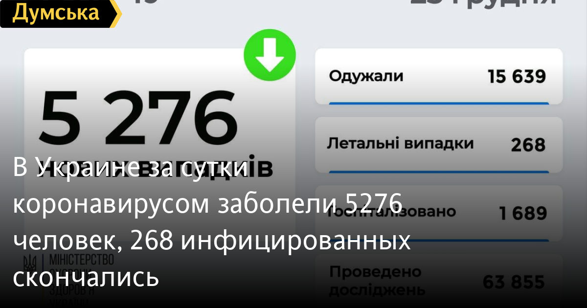 5276 случаев заболевания COVID-19 зафиксировали 24 декабря в Украине. За время пандемии в стране заболели ковидом 3642314 человек.
