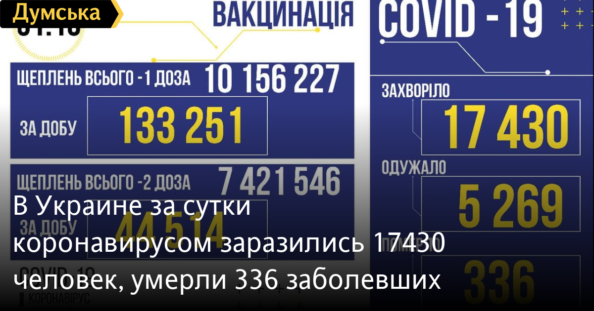 В Украине за сутки коронавирусом заразились 17430 человек, умерли 336 заболевших17430 жителей Украины 30 октября получили подтверждение диагноза COVID-19. За время пандемии заразились уже 2922302 украинца. По данным Минздрава, вчера от осложнений инфекции умерли 336 человек (67729). Выздоровели 5269 пациентов (2436213). Нагрузка на ковидные больницы по стране составляет 68,1% (заняты 48995 коек из 71934). Первую дозу вакцины вчера получили 133251 жителей Украины (10156227), а вторую 44514 человек (7421546). СМЕРТЬ РОССИЙСКИМ ОККУПАНТАМ! Заметили ошибку? Выделяйте слова с ошибкой и нажимайте control-enter Новости по этой теме: 4 марта 2023: "Вакцини-довгожителі", або Як щеплення проти COVID-19 перетворилися в Україні на небезпечний ритуал 27 января 2023: МОЗ обязали опубликовать договоры на закупку вакцин против COVID-19: апелляционный суд удовлетворил иск журналиста "Думской" 11 января 2023: За неделю в Одессе зафиксировано 159 случаев ковида 4 января 2023: За неделю в Одессе зарегистрировано 113 случаев ковида |