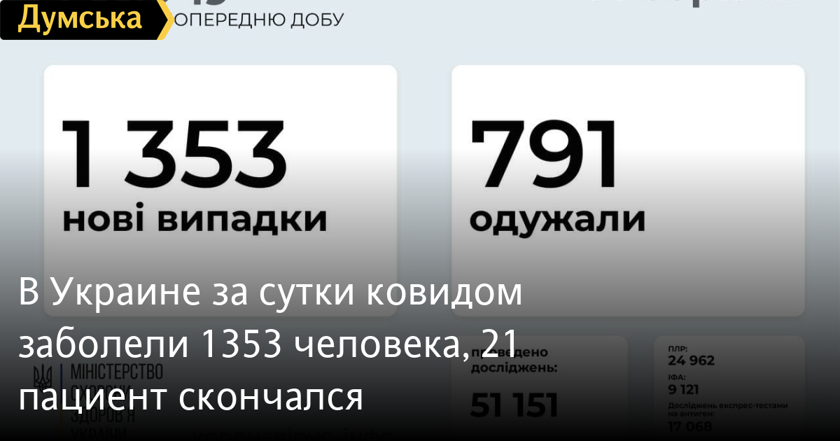 1353 новых случаев заражения коронавирусной инфекцией зафиксировали 13 августа в Украине. За время пандемии в стране «ковидом» заболели 2265217 человек. По данным Минздрава, вчера 21 житель Украины скончался от осложнений коронавируса (53238). 791 пациент вылечился (2196589), «ковидные» больницы по стране заняты на 10,5% (3984 койки из 38118). Вчера первую дозу вакцины получили 106206 украинцев (4644647), а вторую 55586 (2688903). СМЕРТЬ РОССИЙСКИМ ОККУПАНТАМ! Заметили ошибку? Выделяйте слова с ошибкой и нажимайте control-enter |