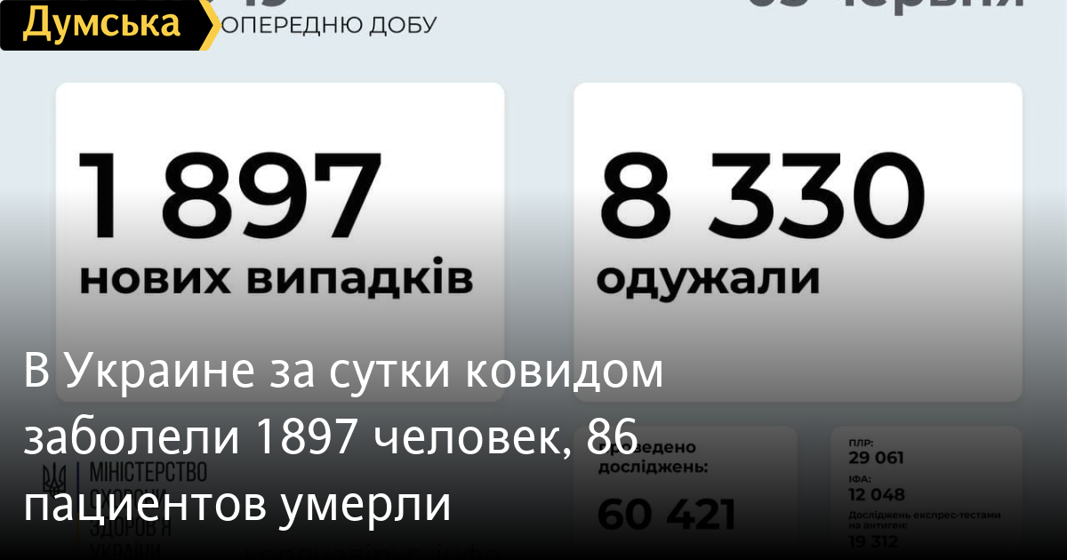 1897 новых случаев заболевания COVID-19 зафиксировали 4 июня в Украине. На первом месте Киев – 497 заразившихся. Как сообщили в Министерстве здравоохранения, число инфицированных «ковидом» за время пандемии в Украине достигло 2213580 человек. От осложнений инфекции вчера скончались 86 украинцев (51140). Наивысшая летальность была в Днепропетровской области – 14 смертей. Выздоровели 8330 человек за сутки (2088712). Больше всего в Киеве – 3171. «Ковидные» госпитали по стране заняты на 14,5% (10480 коек из 72178). СМЕРТЬ РОССИЙСКИМ ОККУПАНТАМ! Заметили ошибку? Выделяйте слова с ошибкой и нажимайте control-enter |