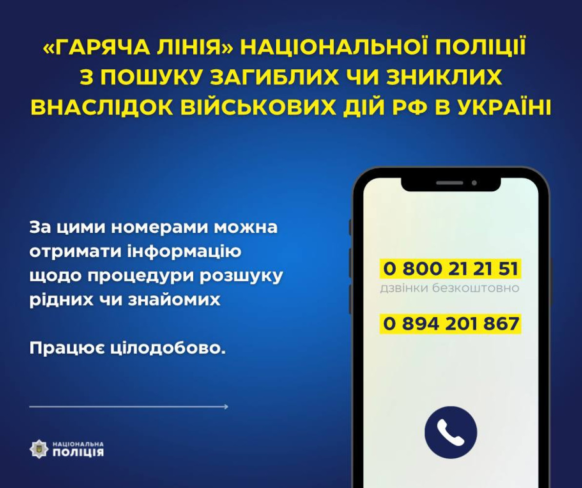 В Украине запустили еще одну спецлинию для поиска пропавших без вести в результате полномасштабного военного вторжения рф в нашу страну. Об этом сообщила пресс-служба Нацполиции Украины. Позвонив на горячую линию 0800212151, можно получить информацию относительно поиска родных или знакомых, пропавших или погибших вследствие российской агрессии. Звонки бесплатные и принимаются операторами круглосуточно. Напомним, что в Украине работает номер горячей линии (16-48; 044-287-81-65) Национального информационного бюро при Министерстве реинтеграции. Операторы линии помогают в поиске пропавших украинских военных и мирных жителей, которые находятся в плену рф. Кроме того, можно обратиться на горячую линию уполномоченного по правам человека (0800 50 17 20). СМЕРТЬ РОСІЙСЬКИМ ОКУПАНТАМ! Помітили помилку? Виділяйте слова з помилкою та натискайте control-enter |