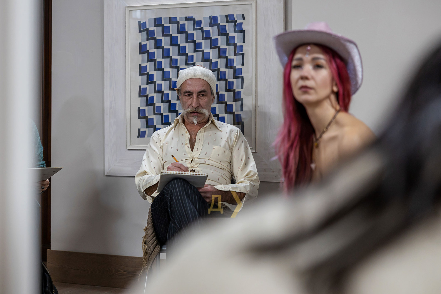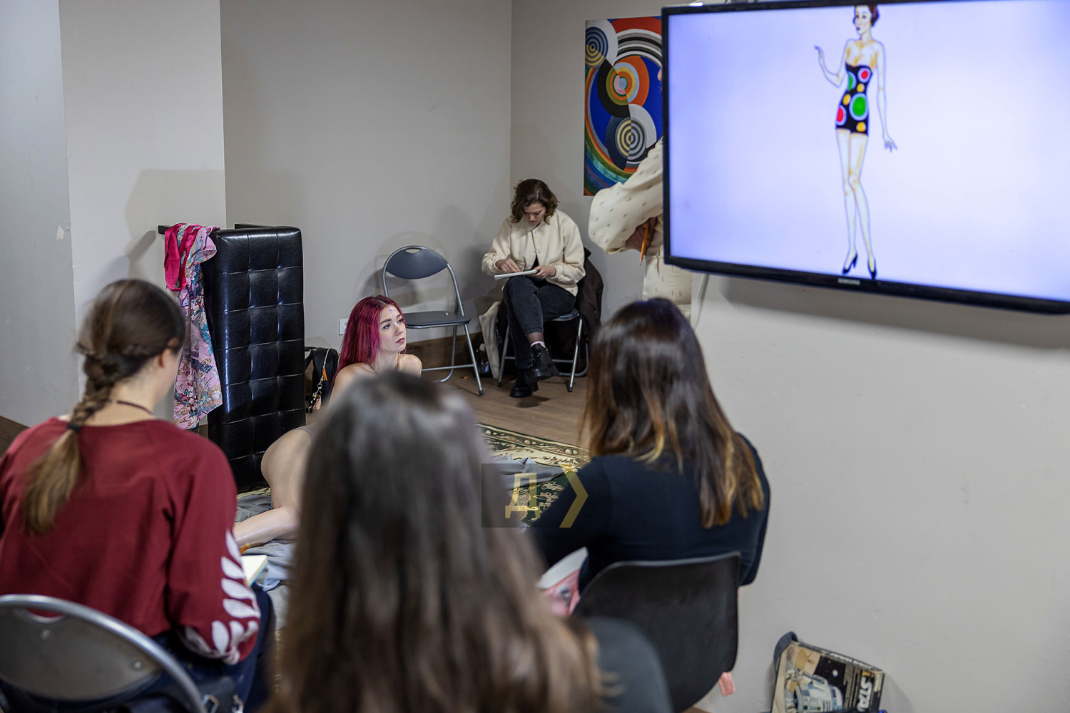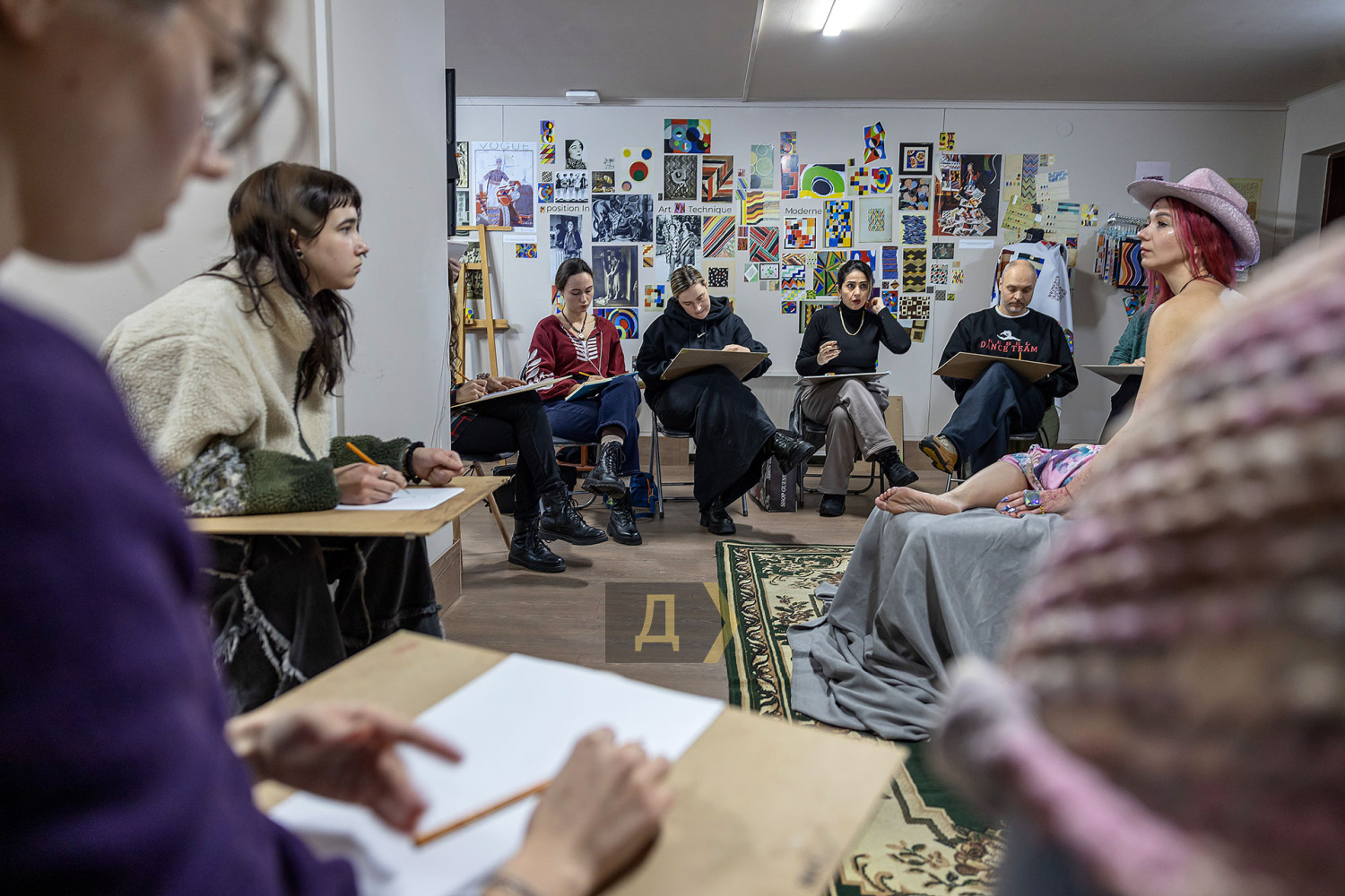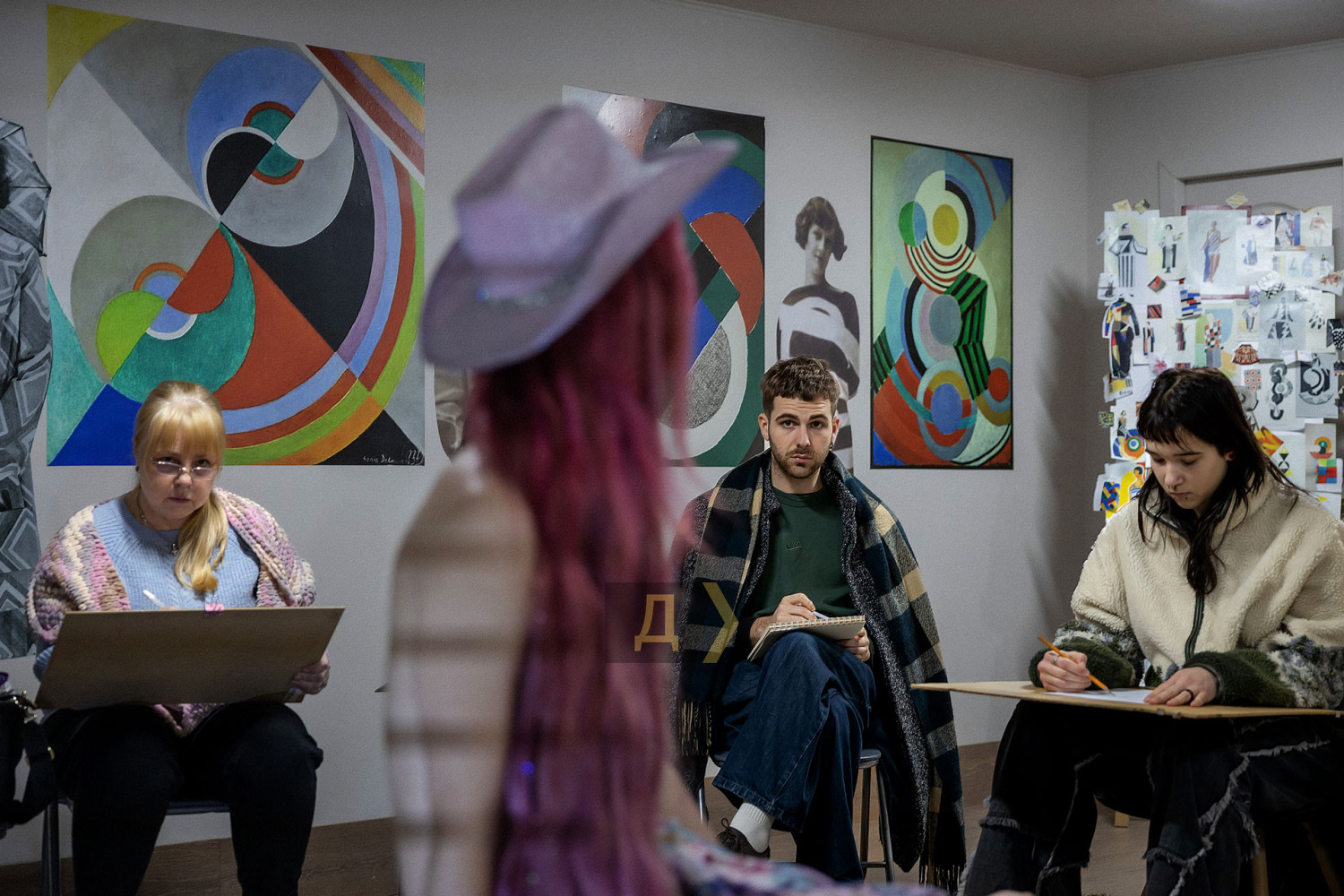 Рисование обнаженной натуры — обязательная база для художника. Без навыка передачи формы живого человеческого тела невозможно стать настоящим мастером, каким бы ни был выбранный стиль. В Одессе работа с натурой — часть учебного процесса во всех профильных заведениях: в Грековке, в Одесской государственной академии строительства и архитектуры, и на худграфе «Педина». К своему стыду, «Думская» ни разу не бывала на подобных занятиях. В год своего совершеннолетия, на 18-м году существования мы решили исправить это досадное упущение и заглянули в музей современного искусства, где также проходят подобные занятия. Слово — нашему корреспонденту Денису Меркурьеву. Занятие проходит в укрытии — на минус первом этаже. Со стен смотрит экспозиция, посвященная Сони Делоне — одесситке, художнице и дизайнерке, чье имя вписано в историю авангарда. Спуск в укрытие прегражден красно-белой сигнальной лентой — мероприятие камерное, только для зарегистрировавшихся. Пока ведущий занятия, одесский художник и дизайнер Владимир Уманенко расставляет стулья и расстилает ковер в центре зала, в помещение впархивает невысокая стройная девушка в ярком дутом костюме — будто с горнолыжного склона. Это Екатерина Ивашинникова, натурщица. Успеваю задать несколько вопросов — и она скрывается в соседней комнате, чтобы подготовиться к работе. Сессия будет длиться два часа с перерывами. За это время модель меняет три-четыре позы. Нужно сидеть, стоять или лежать, почти не двигаясь. Начинаю издалека, интересуюсь насколько сложно не менять позу столько времени. «Это не так сложно, как вы думаете, — рассказывает Екатерина. — Никто не заставляет сидеть в неудобной позе. Если устала — можно походить, размяться». Следующий вопрос уже более интимный: трудно ли раздеваться перед незнакомыми людьми? «Я работаю натурщицей уже третий год, а вообще в моделинге с подросткового возраста, — признается девушка. — Сложно только в первый раз. Потом исчезает стеснение: здесь нет ничего зазорного, это нормальная художественная практика. В академиях так учат десятилетиями». В зал понемногу спускаются участники — люди разного уровня и опыта. Владимир Уманенко поясняет формат: «Это не академический класс и не студия для студентов. Сюда приходят художники, дизайнеры, врачи, юристы — люди разных профессий. Кто-то не рисовал со школы, а кто-то приходит почти на каждую сессию. Моя роль — не учить, а быть тьютором: подсказать, если человек сам этого хочет». Спустя пять минут из отдельной комнаты выходит модель. Образ Екатерины под стать ярким принтам Сони Делоне — розовые волосы водопадом струятся к осиной талии, прикрывая аккуратную грудь, на щеках — россыпь блестящих веснушек, на лбу — украшение из граненых камней, на голове — шляпка. Один из художников вслух отмечает красоту фигуры модели — и тут же получает мягкое, но четкое замечание от ведущего: подобные комментарии здесь неуместны. Это рабочее пространство, а не обсуждение внешности. Уманенко спрашивает участников — стоит ли оставлять шляпу. Гости мероприятия соглашаются, что головной убор придает оголенной фигуре интересный акцент. Класс начинает работать. У каждого свой подход: карандаш или пастель, работа с цветом с первых штрихов, бумага или цифровой планшет. Рисовать нужно быстро — схватывать форму, а не «вылизывать» 