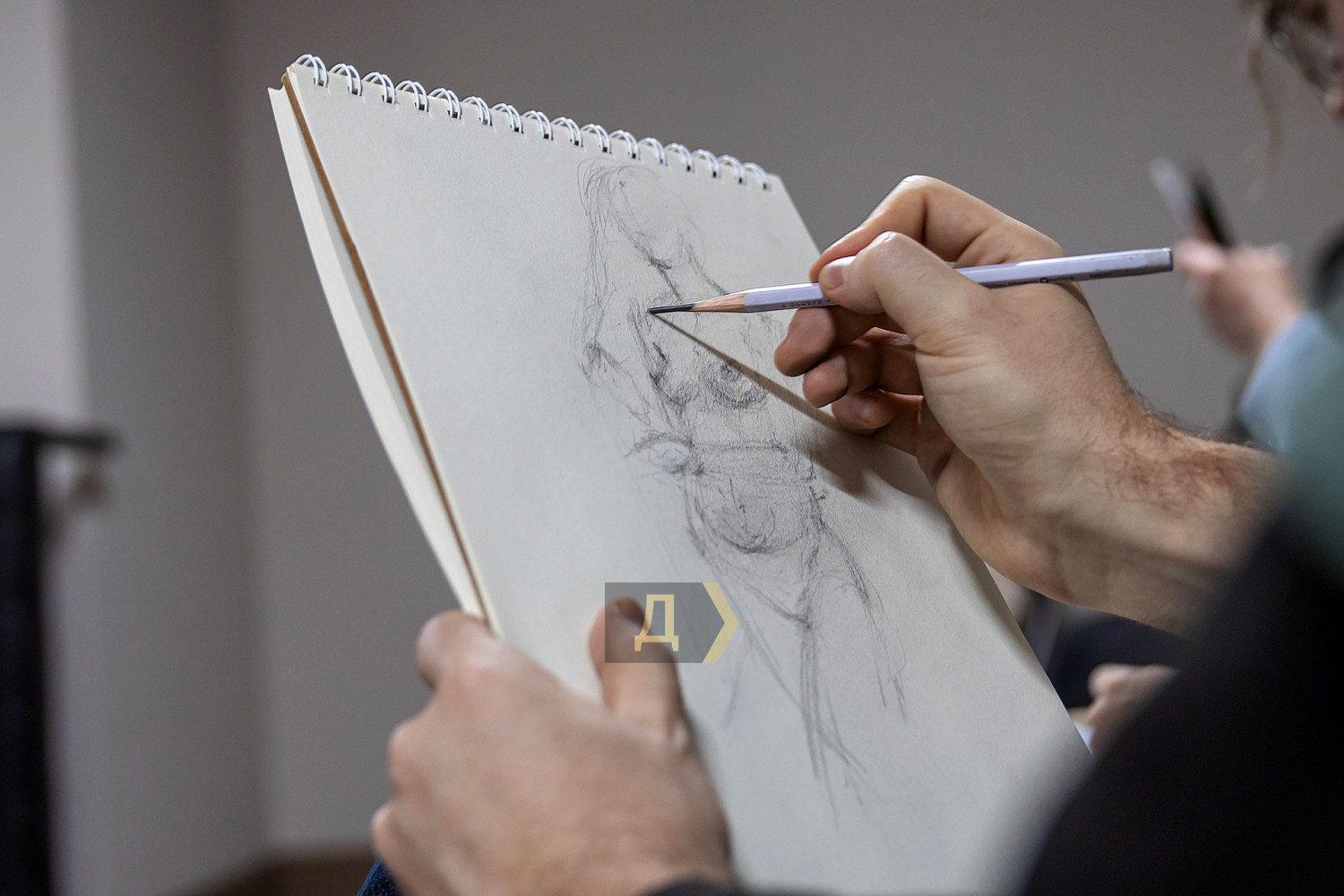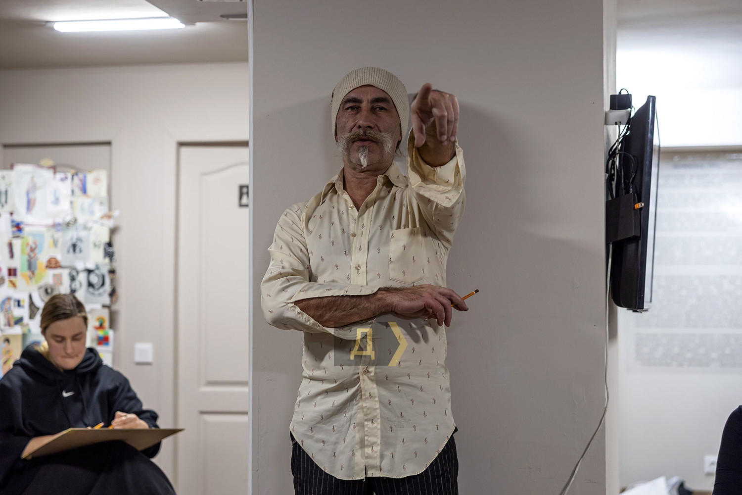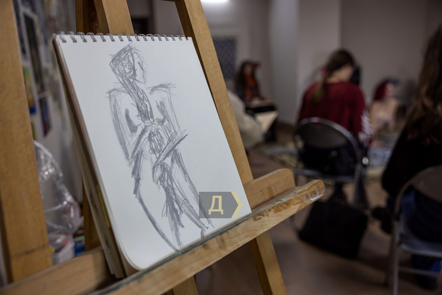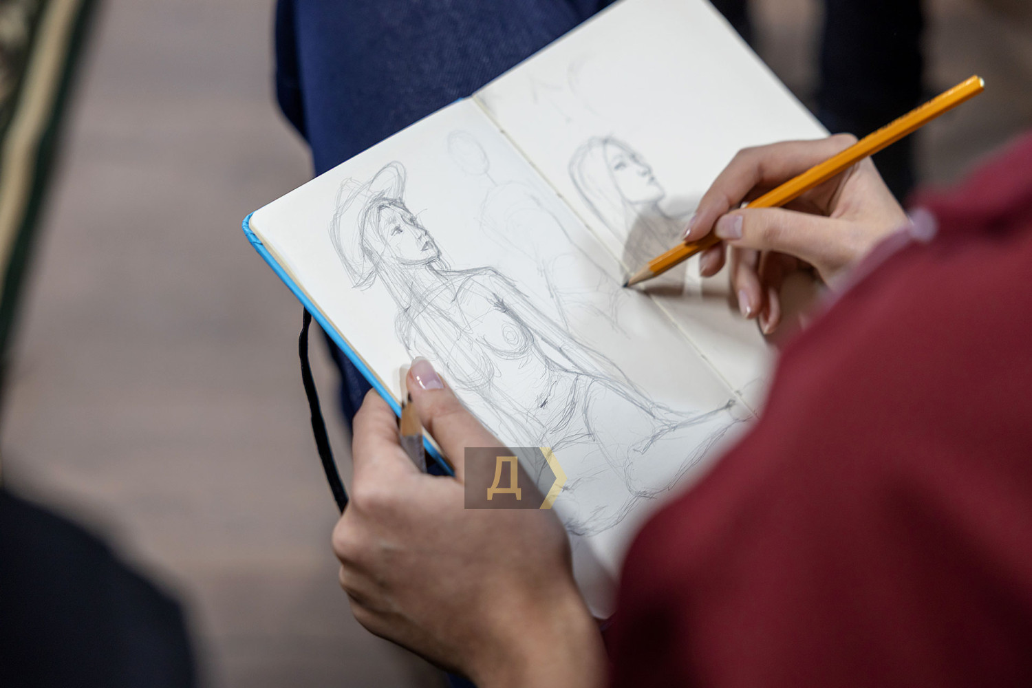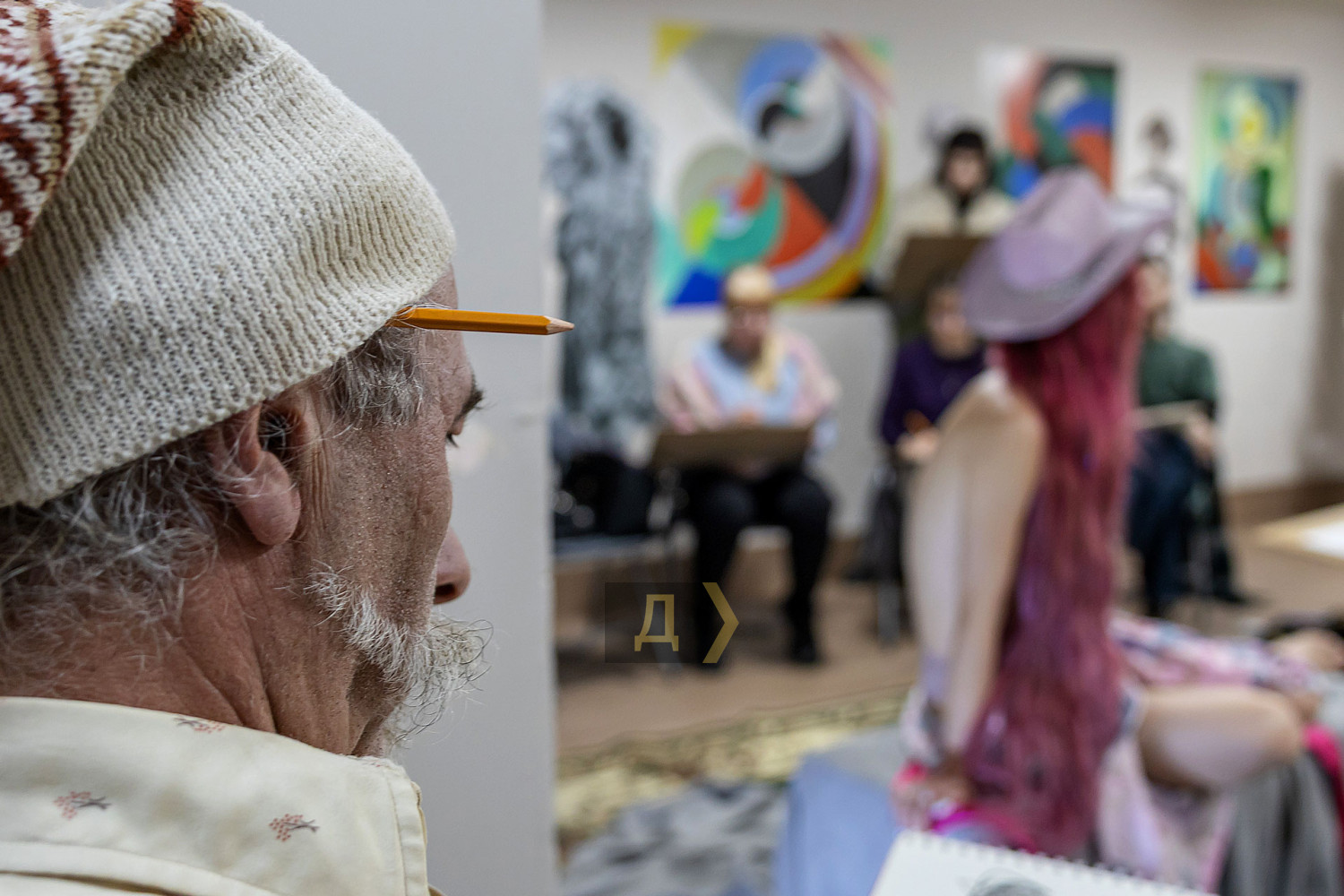 Рисование обнаженной натуры — обязательная база для художника. Без навыка передачи формы живого человеческого тела невозможно стать настоящим мастером, каким бы ни был выбранный стиль. В Одессе работа с натурой — часть учебного процесса во всех профильных заведениях: в Грековке, в Одесской государственной академии строительства и архитектуры, и на худграфе «Педина». К своему стыду, «Думская» ни разу не бывала на подобных занятиях. В год своего совершеннолетия, на 18-м году существования мы решили исправить это досадное упущение и заглянули в музей современного искусства, где также проходят подобные занятия. Слово — нашему корреспонденту Денису Меркурьеву. Занятие проходит в укрытии — на минус первом этаже. Со стен смотрит экспозиция, посвященная Сони Делоне — одесситке, художнице и дизайнерке, чье имя вписано в историю авангарда. Спуск в укрытие прегражден красно-белой сигнальной лентой — мероприятие камерное, только для зарегистрировавшихся. Пока ведущий занятия, одесский художник и дизайнер Владимир Уманенко расставляет стулья и расстилает ковер в центре зала, в помещение впархивает невысокая стройная девушка в ярком дутом костюме — будто с горнолыжного склона. Это Екатерина Ивашинникова, натурщица. Успеваю задать несколько вопросов — и она скрывается в соседней комнате, чтобы подготовиться к работе. Сессия будет длиться два часа с перерывами. За это время модель меняет три-четыре позы. Нужно сидеть, стоять или лежать, почти не двигаясь. Начинаю издалека, интересуюсь насколько сложно не менять позу столько времени. «Это не так сложно, как вы думаете, — рассказывает Екатерина. — Никто не заставляет сидеть в неудобной позе. Если устала — можно походить, размяться». Следующий вопрос уже более интимный: трудно ли раздеваться перед незнакомыми людьми? «Я работаю натурщицей уже третий год, а вообще в моделинге с подросткового возраста, — признается девушка. — Сложно только в первый раз. Потом исчезает стеснение: здесь нет ничего зазорного, это нормальная художественная практика. В академиях так учат десятилетиями». В зал понемногу спускаются участники — люди разного уровня и опыта. Владимир Уманенко поясняет формат: «Это не академический класс и не студия для студентов. Сюда приходят художники, дизайнеры, врачи, юристы — люди разных профессий. Кто-то не рисовал со школы, а кто-то приходит почти на каждую сессию. Моя роль — не учить, а быть тьютором: подсказать, если человек сам этого хочет». Спустя пять минут из отдельной комнаты выходит модель. Образ Екатерины под стать ярким принтам Сони Делоне — розовые волосы водопадом струятся к осиной талии, прикрывая аккуратную грудь, на щеках — россыпь блестящих веснушек, на лбу — украшение из граненых камней, на голове — шляпка. Один из художников вслух отмечает красоту фигуры модели — и тут же получает мягкое, но четкое замечание от ведущего: подобные комментарии здесь неуместны. Это рабочее пространство, а не обсуждение внешности. Уманенко спрашивает участников — стоит ли оставлять шляпу. Гости мероприятия соглашаются, что головной убор придает оголенной фигуре интересный акцент. Класс начинает работать. У каждого свой подход: карандаш или пастель, работа с цветом с первых штрихов, бумага или цифровой планшет. Рисовать нужно быстро — схватывать форму, а не «вылизывать» 