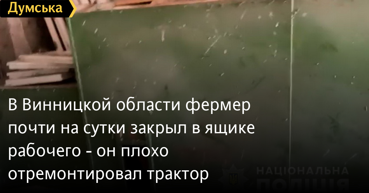В Винницкой области фермер почти на сутки закрыл в ящике рабочего — он плохо отремонтировал тракторФермеру из села Вербовка Винницкой области вручили подозрение за то, что он незаконно лишил свободы своего работника. Как информирует региональное управление Нацполиции, почти сутки в жару 43-летний мужчина провел в металлической сушилке для фруктов. При этом начальник не давал ему ни есть, ни пить. Благо, крики о помощи услышала местная жительница и сообщила в полицию. Уточняется, что ящик, где сидел рабочий, находится внутри бункера, который снаружи засыпан зерном. Чтобы освободить заложника, полицейским пришлось расчищать проход лопатой. Как стало известно, пострадавший неофициально устроился разнорабочим к фермеру. Но за все время он не получил от работодателя ни копейки. Более того, фермер обвинял подчиненного в том, что тот, мол, не справляется с работой, а в сушилке закрыл из-за того, что рабочий якобы плохо отремонтировал ему трактор. Действия фермера квалифицированы, как незаконное лишение свободы человека с причинением физических страданий. СМЕРТЬ РОССИЙСКИМ ОККУПАНТАМ! Заметили ошибку? Выделяйте слова с ошибкой и нажимайте control-enter Новости по этой теме: 12 января 2022: Харьковские станции метро ожидает масштабная проверка: в вестибюле подземки на площади Конституции рухнул потолок (фото) 8 января 2022: В Одессе из офиса фирмы выкрали сейф с внушительной суммой денег, золотом и пистолетом 27 декабря 2021: В лесополосе под Киевом нашли тело главврача из Ровенской области: по подозрению в убийстве задержаны таксист с приятелем 23 декабря 2021: В Киеве задержали подозреваемых мошенников, которые обманывали на свиданиях мужчин ради денег |