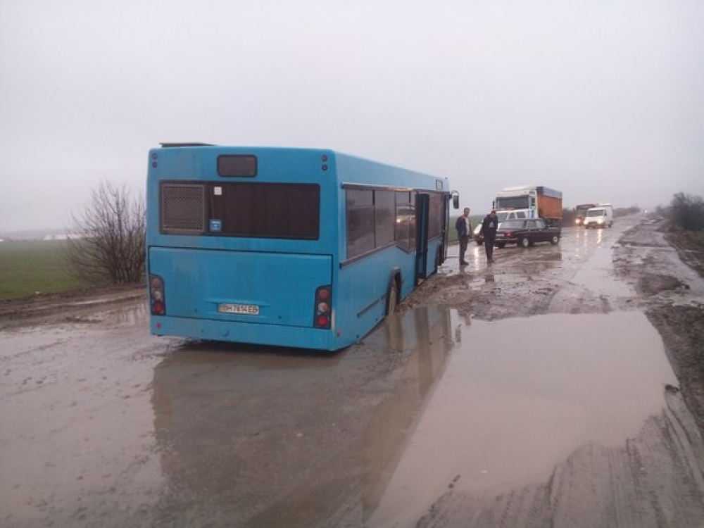 Автобус, доставлявший на работу сотрудников завода, застрял на автодороге «Одесса-Южный», в районе села Визирка. Как сообщают очевидцы, инцидент произошел 29 марта. Фактически дороги на этом участке нет – сплошные ямы. Водитель автобуса из-за дождя не смог оценить глубину одной из них и застрял задним колесом. Вытаскивать его пришлось с помощью спецтехники.