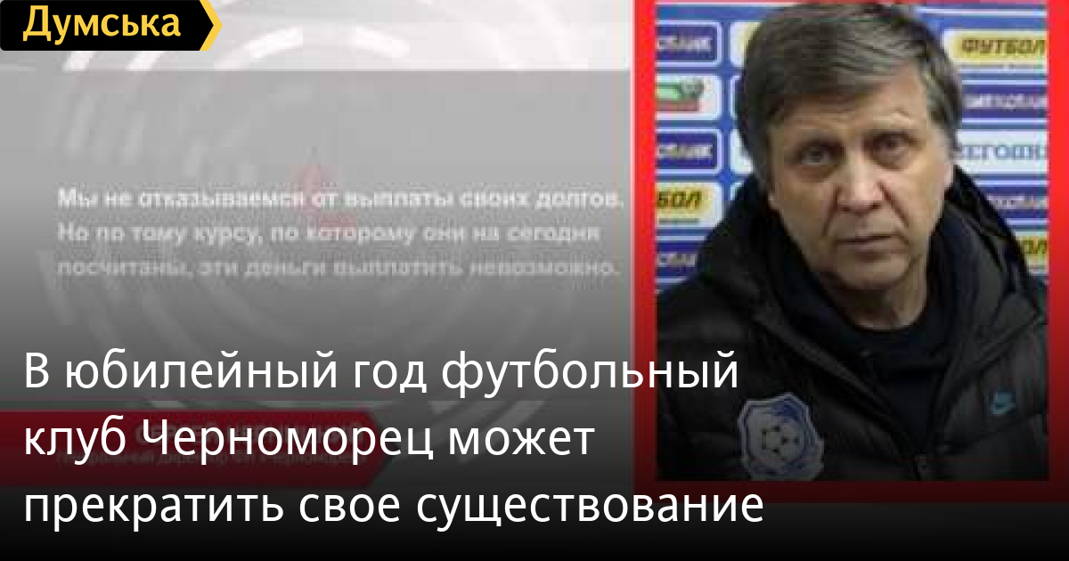 В юбилейный год футбольный клуб «Черноморец» может прекратить свое существованиеВ юбилейный год футбольный клуб «Черноморец» может прекратить свое существование. Хозяйственный суд Одесской области частично удовлетворил иск «Сбербанка», который является дочерним предприятием одноименного финансового учреждения России. СМЕРТЬ РОССИЙСКИМ ОККУПАНТАМ! Заметили ошибку? Выделяйте слова с ошибкой и нажимайте control-enter Думская ТВ. Сюжеты: