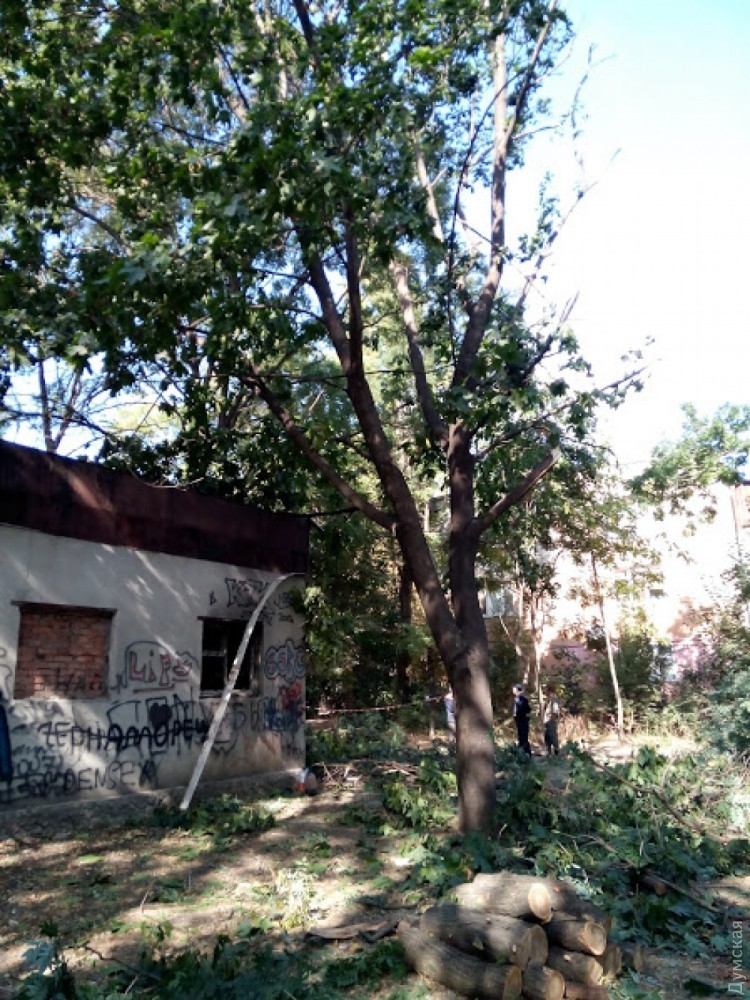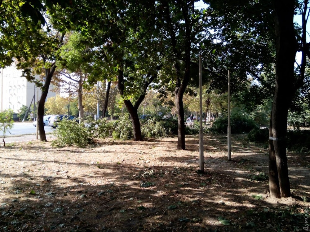 Как рассказали «Думской» местные жители, с утра там появились техника и рабочие, которые отметили зеленой краской 21 здоровое дерево вокруг заброшенного магазина (Грушевского, 40), после чего начали их спиливать под корень. Они успели уничтожить шесть больших здоровых деревьев (софор и акаций) возрастом более 40-50 лет. Остановили рабочих жильцы соседних домов, с которыми никто ничего не согласовывал.