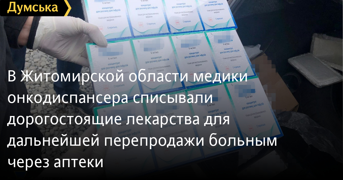 В Житомирской области медики онкодиспансера списывали дорогостоящие лекарства для дальнейшей перепродажи больным через аптекиМедиков Житомирского областного онкологического диспансера подозревают в организации коррупционной схемы по продаже дорогостоящих лекарств, предназначавшихся пациентам бесплатно. Как сообщает пресс-центр СБУ, злоумышленники заставляли онкобольных покупать препараты в аптеках, в то время, как должны были получать их от государства. «По имеющейся информации, организовал противоправную деятельность заведующий одного из отделений онкоцентра вместе со своим коллегой. Медики назначали онкобольным лечение, а дорогостоящие лекарства предлагали покупать в аптеках — при том, что данные медикаменты они бесплатно получали от государства на каждого больного», — сообщают в СБУ. Подозреваемые списывали полученные препараты и продавали их частным аптекам за половину цены. Лекарства сбывали в нескольких областных центрах в течение последних шести месяцев. В ходе обысков у сообщников нашли почти 500 тыс. гривен и очередную партию препаратов — 50 упаковок. Досудебное следствие продолжается.