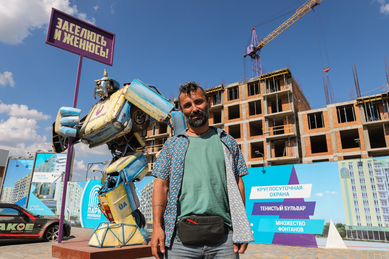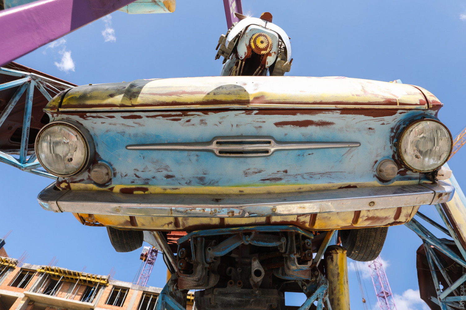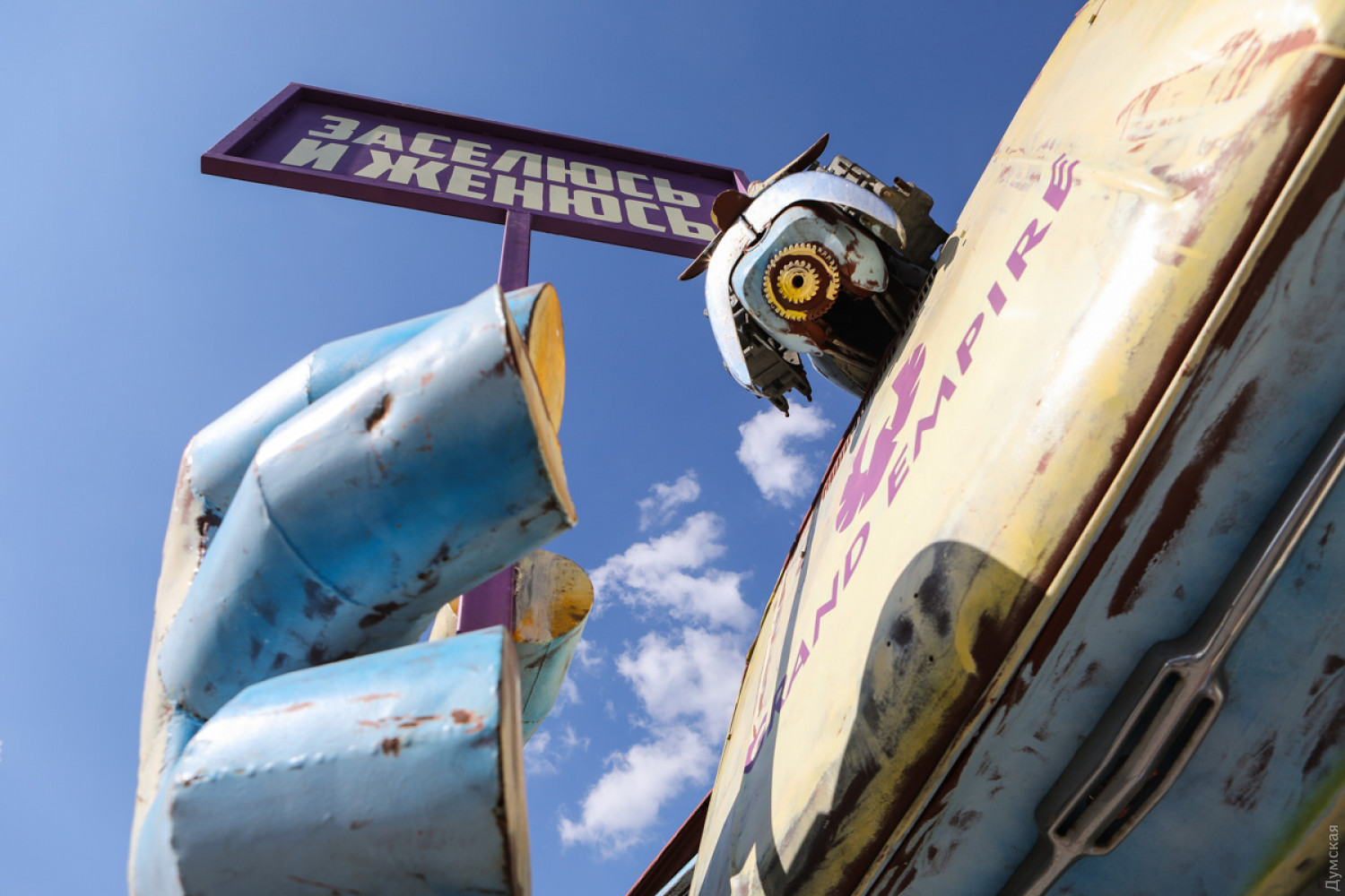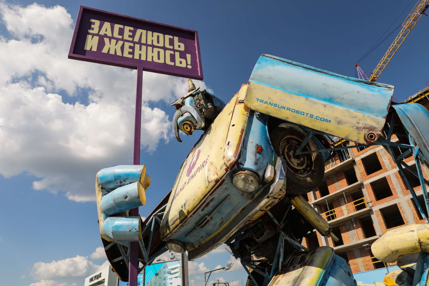 Известный одесситам трансформер дедушка Бамблби, созданный инженером-скульптором Александром Миловым, наконец, определился с постоянным местом жительства и поселился в ЖК «Парк Фонтанов». Эта композиция, напомним, появилась в прошлом году и создана из деталей старых «Запорожцев». Идея создания у автора появилась после просмотра «Трансформеров». Укробот дедушка Бамблби — это наш ответ американским роботам. Высота трансформера — 4 метра, вес - больше тонны.