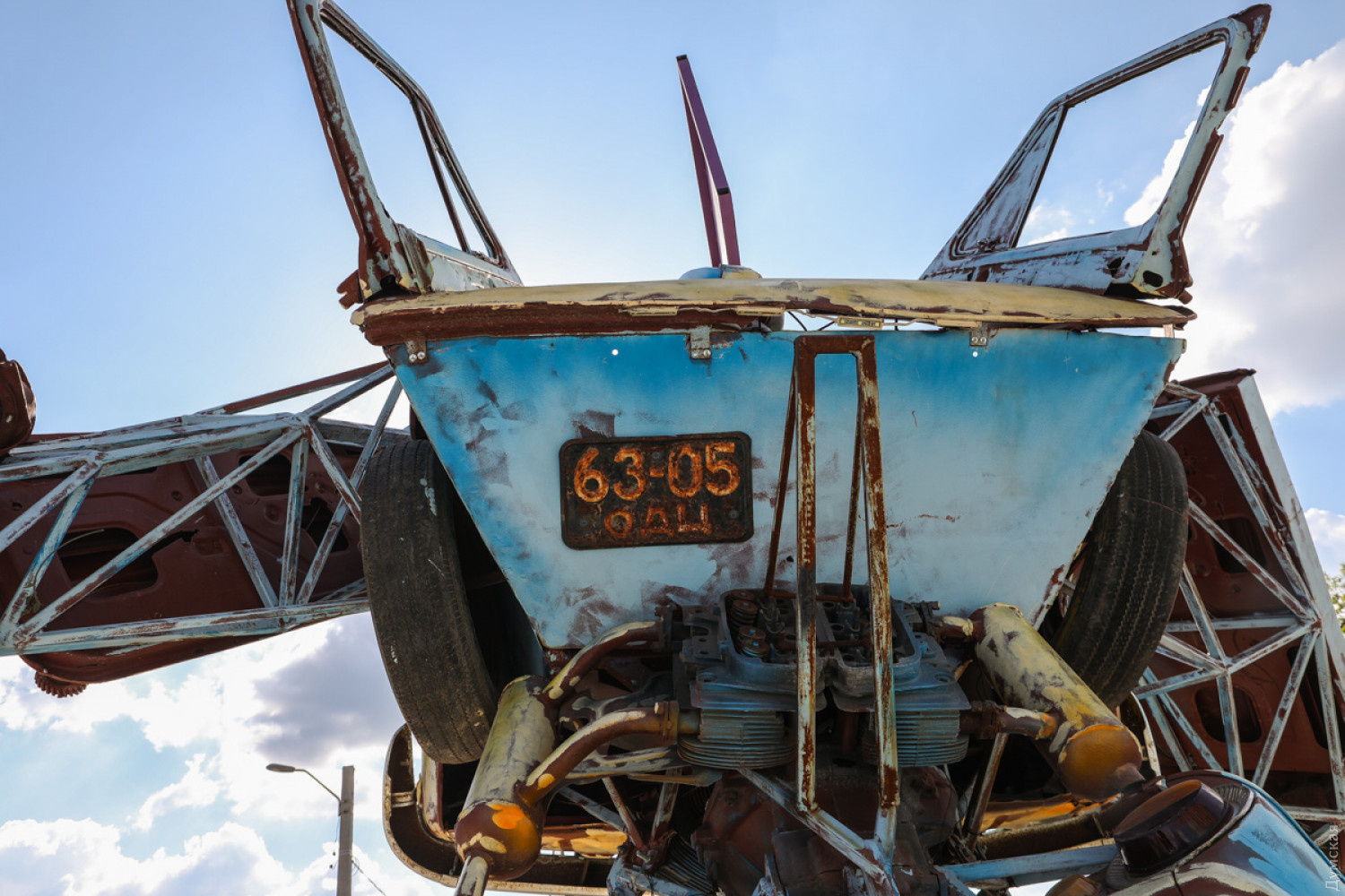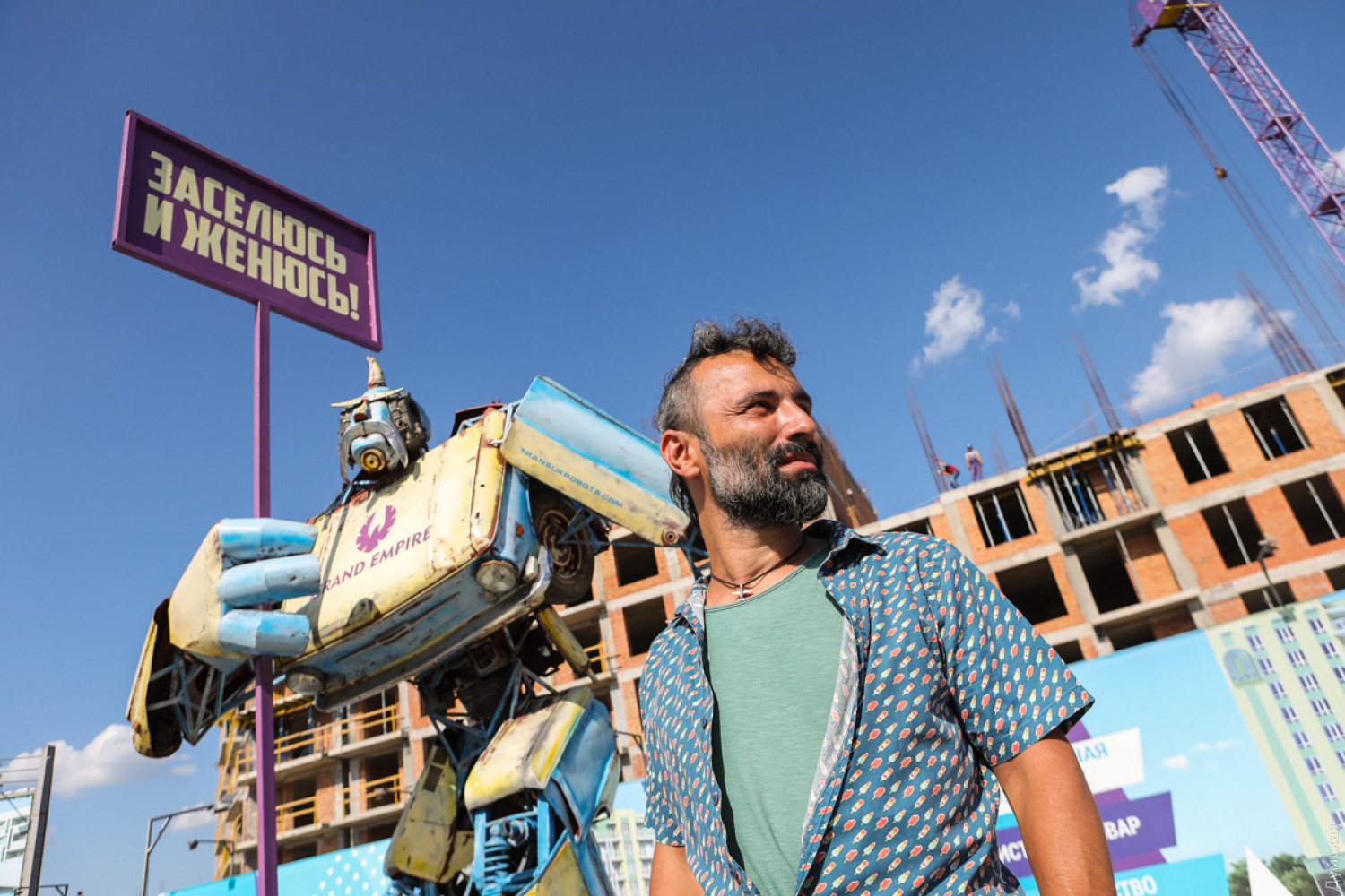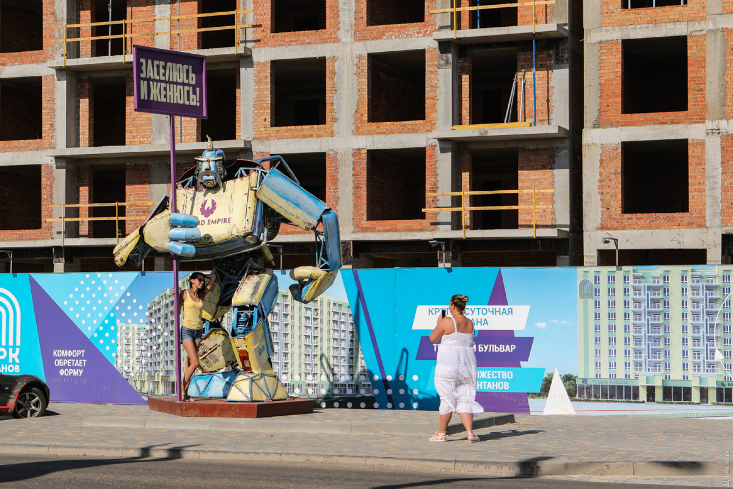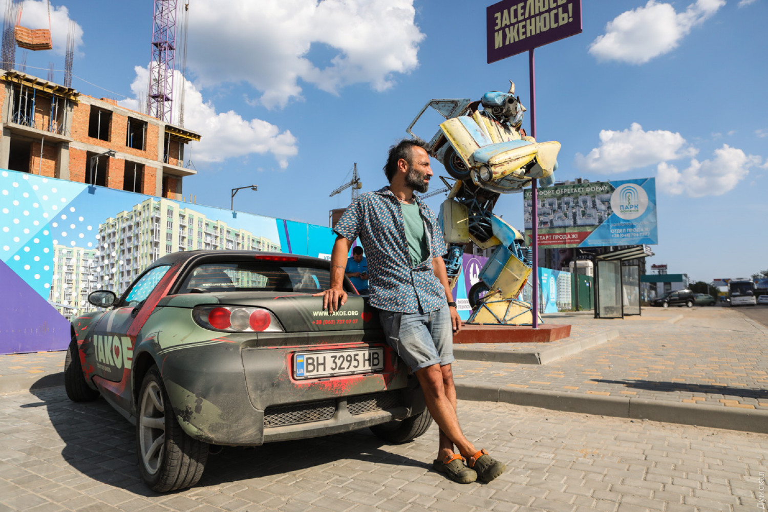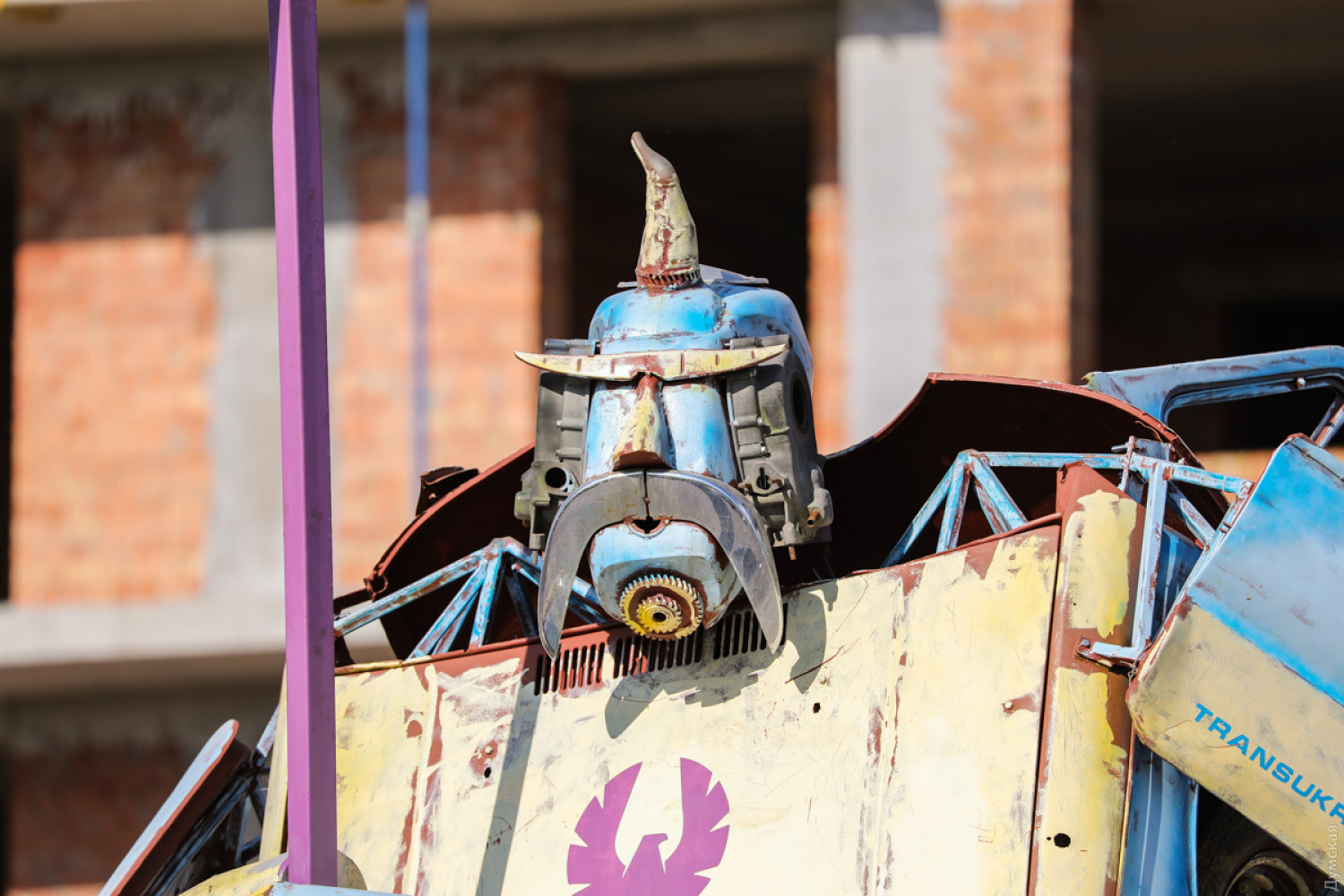 Известный одесситам трансформер дедушка Бамблби, созданный инженером-скульптором Александром Миловым, наконец, определился с постоянным местом жительства и поселился в ЖК «Парк Фонтанов». Эта композиция, напомним, появилась в прошлом году и создана из деталей старых «Запорожцев». Идея создания у автора появилась после просмотра «Трансформеров». Укробот дедушка Бамблби — это наш ответ американским роботам. Высота трансформера — 4 метра, вес - больше тонны.