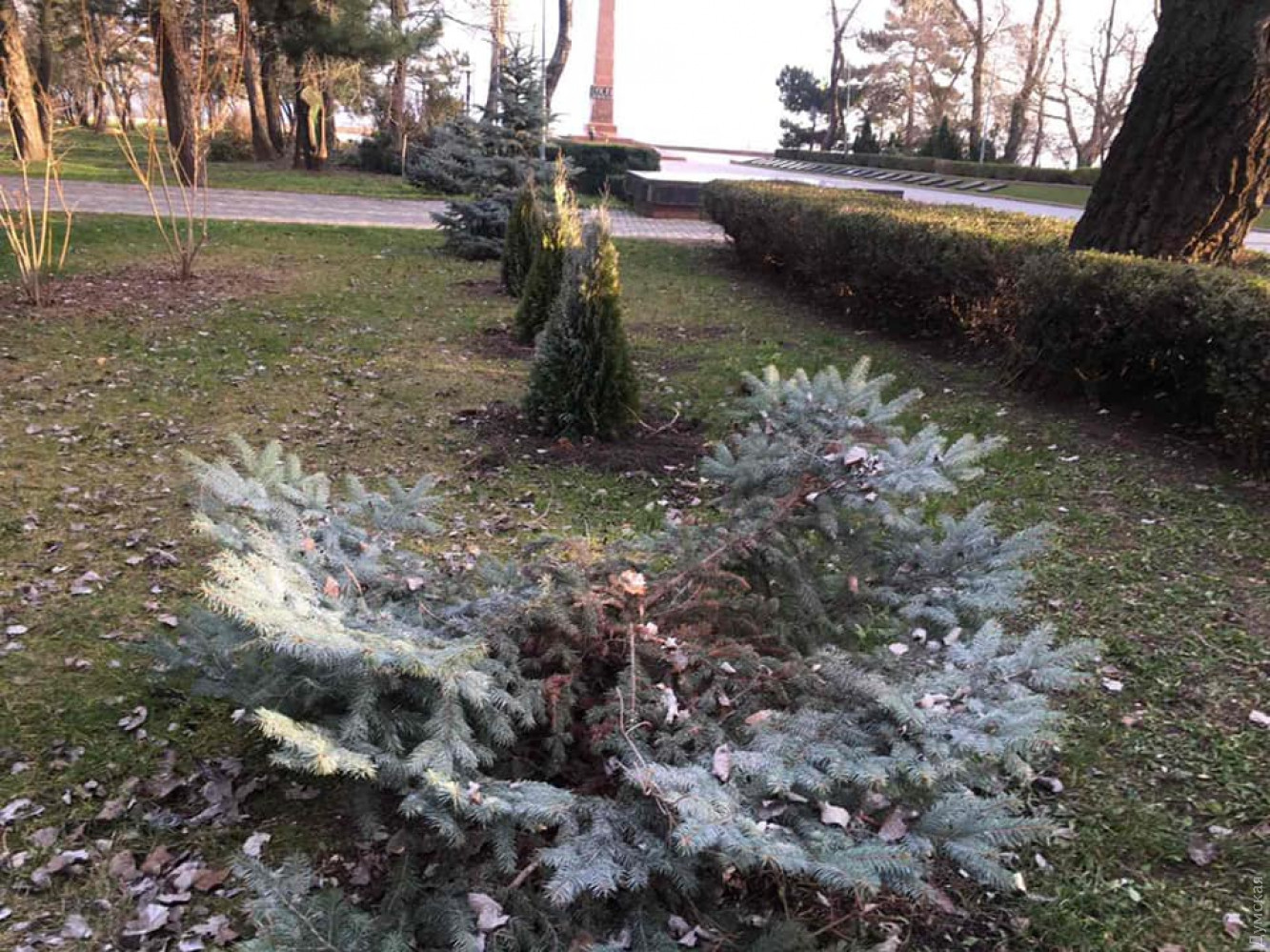 Минувшей ночью неизвестные вандалы срезали голубую ель в одесском парке Шевченко. Примерно неделю назад была украдена еще одна ель.