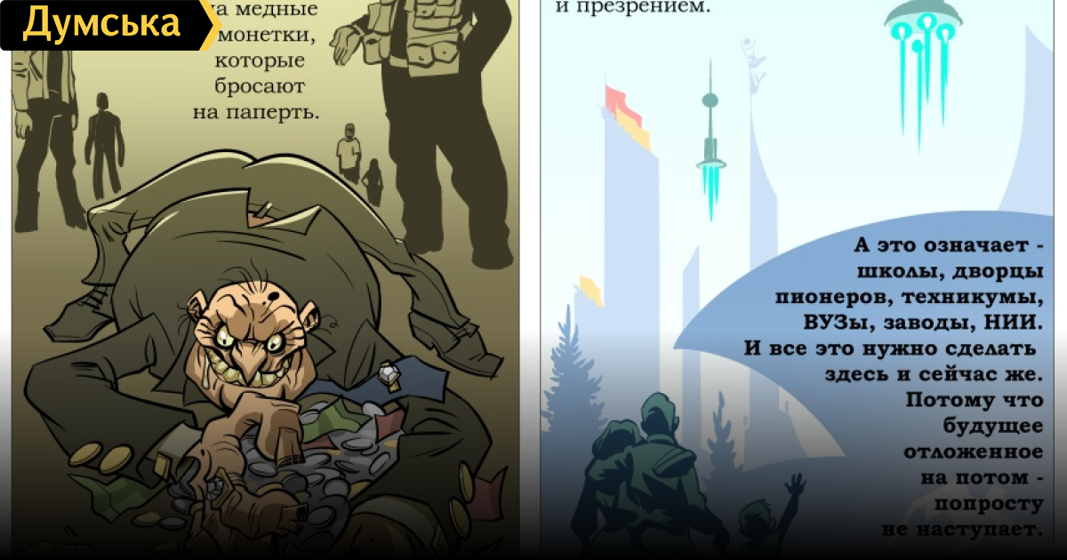 «Мечта стать богатым, приватизировать кусок Родины и превратиться в олигарха — это мечты для нищих. Эти мечты похожи на медные монетки, которые бросают на паперть», — отмечается в агитке «интеллектуала».