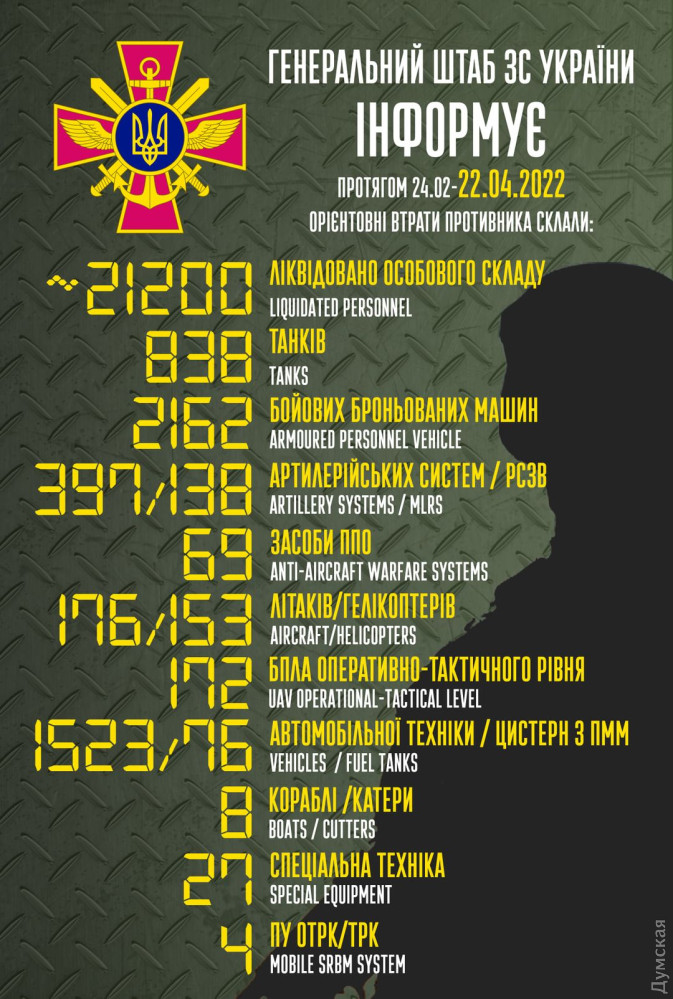 Российские оккупанты за сутки потеряли 200 солдат, четыре самолета, два вертолета и 44 бронемашиныПотери российской армии с начала полномасштабного вторжения в Украину достигли 21200 солдат и офицеров. Около 200 врагов полегли за вчерашний день. Генеральный штаб Вооруженных сил Украины сообщает, что вчера были уничтожены: Девять танков (838); 44 бронемашины (2162); Две системы ПВО (69); Две реактивные системы залпового огня (138); Четыре артиллерийские системы (397); 15 грузовиков (1523); Четыре самолета (176); Два вертолета (153); Шесть оперативно-тактических беспилотников (172). СМЕРТЬ РОСІЙСЬКИМ ОКУПАНТАМ! Помітили помилку? Виділяйте слова з помилкою та натискайте control-enter |